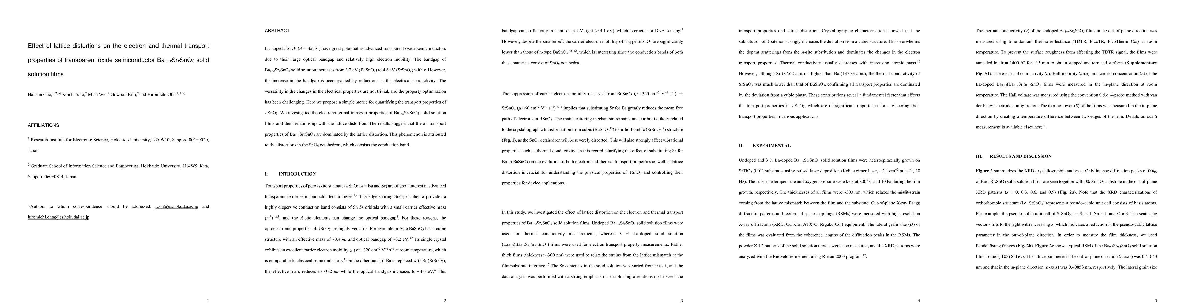 This study investigates the impact of lattice distortions on the electron and thermal transport properties in Ba1-xSrxSnO3 transparent oxide semiconductor films. The findings indicate that lattice distortions, particularly in the SnO6 octahedron, significantly influence the transport properties, complicating the optimization of these materials.