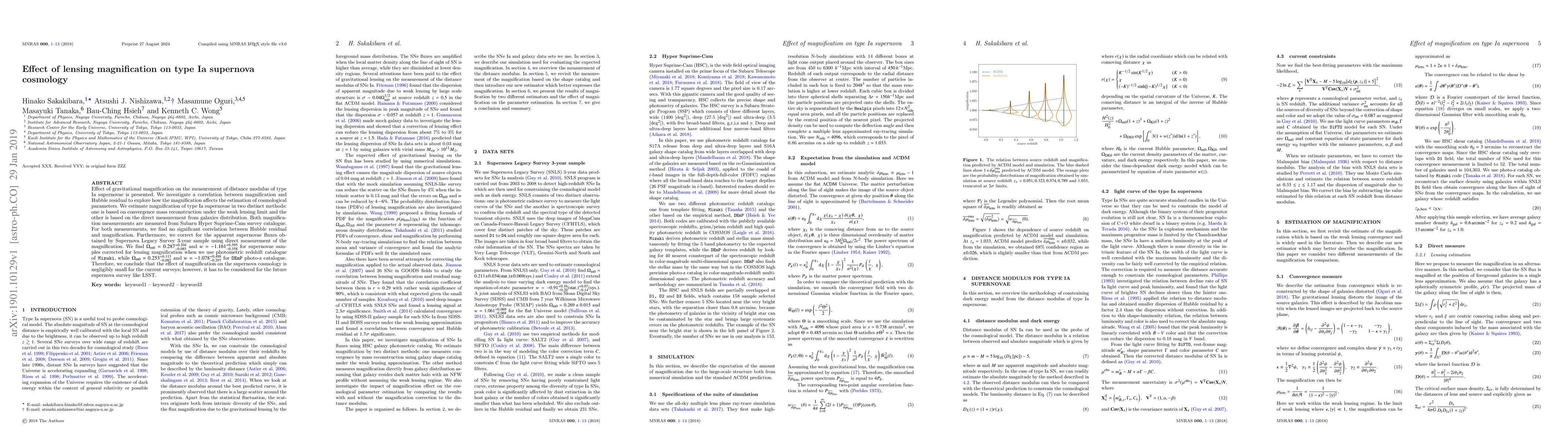 Effect of gravitational magnification on the measurement of distance modulus of type Ia supernovae is presented. We investigate a correlation between magnification and Hubble residual to explore how the magnification affects the estimation of cosmological parameters. We estimate magnification of type Ia supernovae in two distinct methods: one is based on convergence mass reconstruction under the weak lensing limit and the other is based on the direct measurement from galaxies distribution. Both magnification measurements are measured from Subaru Hyper Suprime-Cam survey catalogue. For both measurements, we find no significant correlation between Hubble residual and magnification. Furthermore, we correct for the apparent supernovae fluxes obtained by Supernova Legacy Survey 3-year sample using direct measurement of the magnification. We find $\Omega_{\rm m0} = 0.287 ^{+0.104} _{-0.085}$ and $w = -1.161 ^{+0.595}_{-0.358}$ for supernovae samples corrected for lensing magnification when we use photometric redshift catalogue of Mizuki, while $\Omega_{\rm m0} = 0.253 ^{+0.113} _{-0.087}$ and $w = -1.078 ^{+0.498} _{-0.297}$ for DEmP photo-z catalogue. Therefore, we conclude that the effect of magnification on the supernova cosmology is negligibly small for the current surveys; however, it has to be considered for the future supernova survey like LSST.