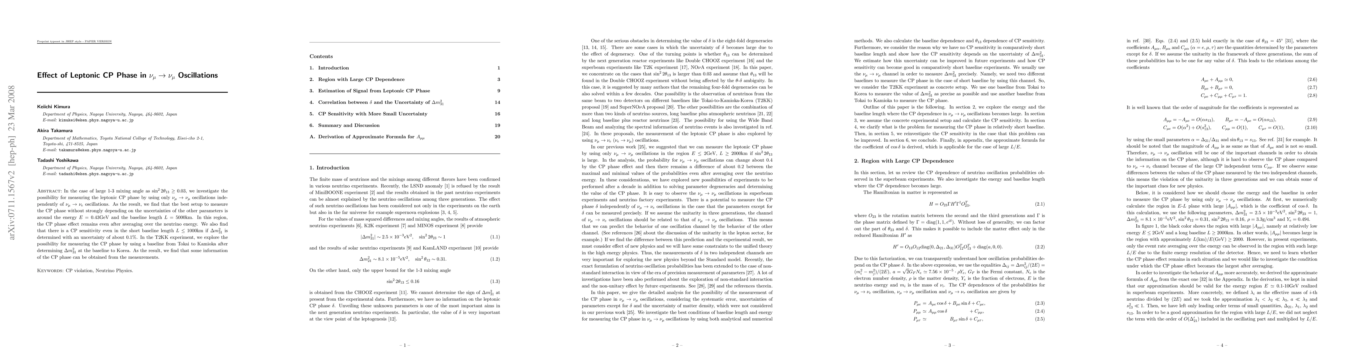 In the case of large 1-3 mixing angle as sin^2(2theta13 > 0.03, we investigate the possibility for measuring the leptonic CP phase by using only nu_mu --> nu_mu oscillations independently of nu_mu --> nu_e oscillations. As the result, we find that the CP phase can be measured best around the energy E=0.43 GeV and the baseline length L=5000km without strongly depending on the uncertainties of other parameters. In this region, the CP phase effect remains even after averaging over neutrino energy. We also find that there is the CP sensitivity even in the short baseline length L < 1000 km if Delta m_{31}^2 is determined with the uncertainty of about 0.1 . In the T2KK experiment, we explore the possibility for determining Delta m_{31}^2 by using one baseline from Tokai to Korea and then measuring the CP phase by using the baseline to Kamioka. As the result, we find that some information of the CP phase can be obtained from both measurements.