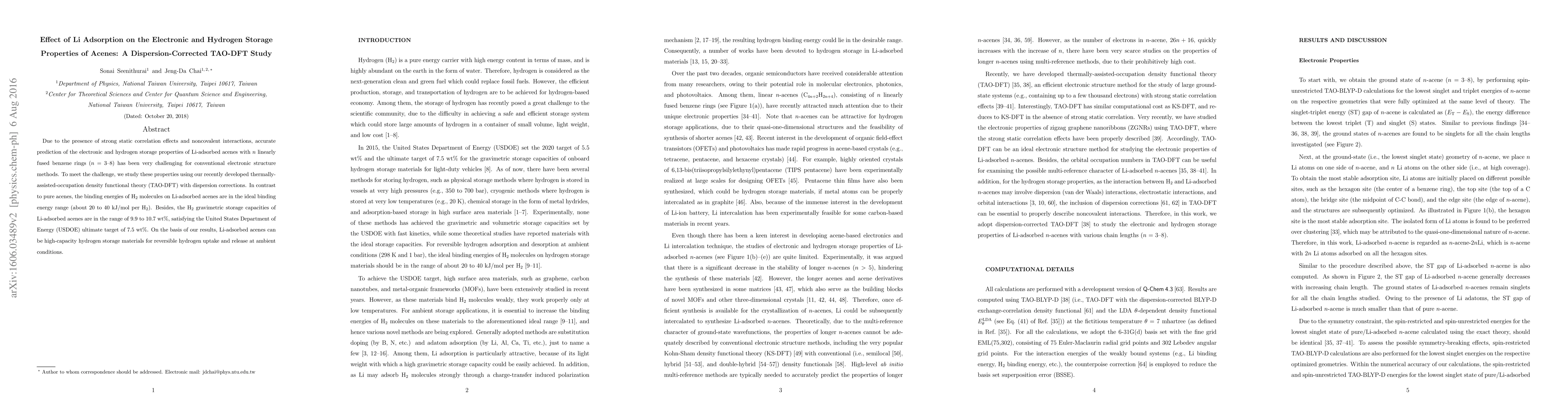 This study uses dispersion-corrected TAO-DFT to predict the electronic and hydrogen storage properties of Li-adsorbed acenes, finding optimal binding energies for H2 molecules and gravimetric storage capacities meeting USDOE targets, indicating potential as high-capacity hydrogen storage materials.