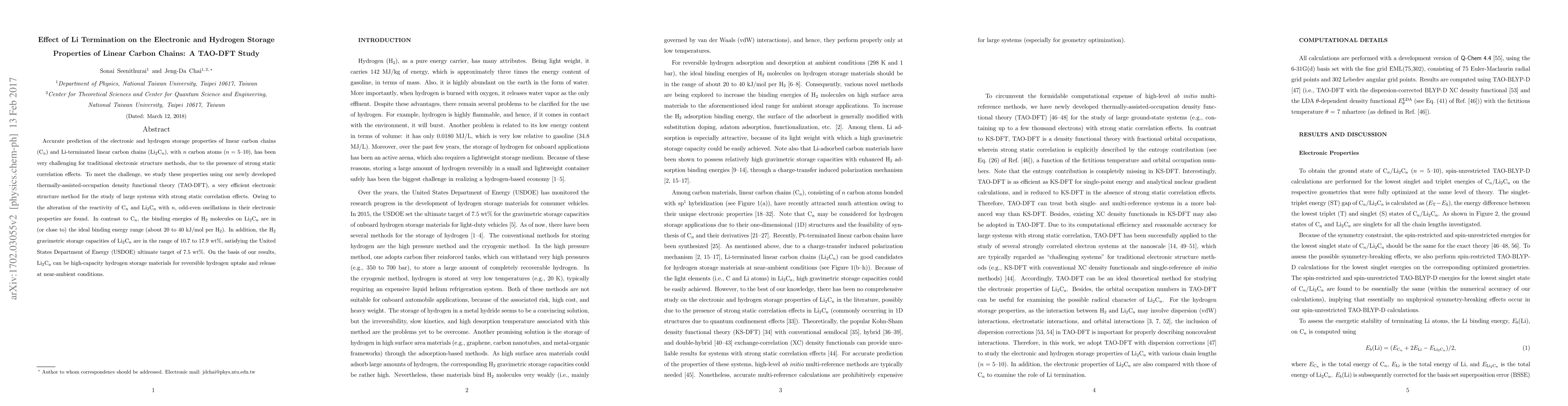 This study uses thermally-assisted-occupation density functional theory (TAO-DFT) to investigate the electronic and hydrogen storage properties of linear carbon chains (Cn) and Li-terminated linear carbon chains (Li2Cn). The results show that Li2Cn exhibits ideal binding energies for H2 and gravimetric storage capacities meeting the USDOE target, suggesting it as a promising material for hydrogen storage.