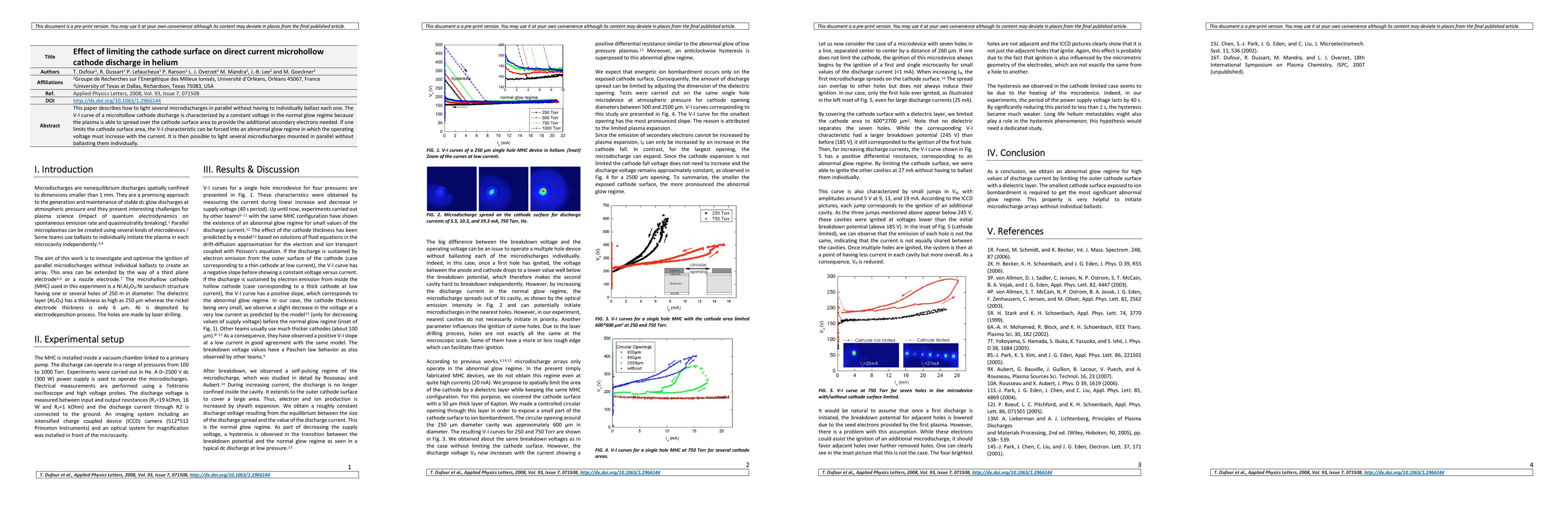 This paper investigates how limiting the cathode surface area in a direct current microhollow cathode discharge in helium can shift the V-I characteristic to an abnormal glow regime, enabling multiple parallel microdischarges without individual ballasting. The plasma spreads over the cathode surface to provide secondary electrons, but restricted area forces higher operating voltages with increased current.