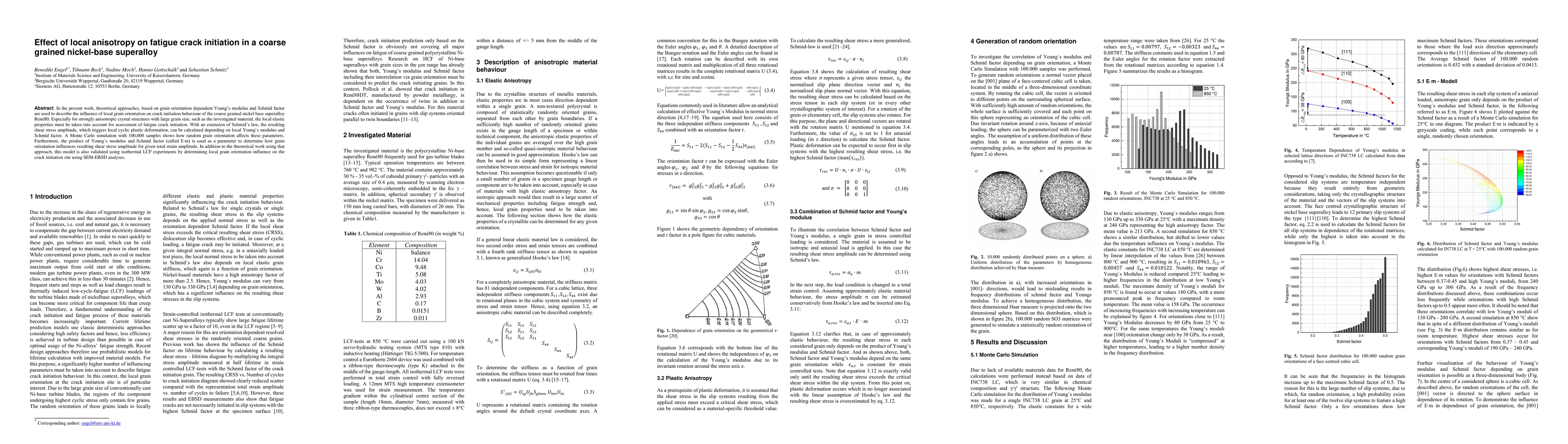 This paper explores the impact of local anisotropy on fatigue crack initiation in a coarse-grained nickel-base superalloy, utilizing grain orientation-dependent Young's modulus and Schmid factor. The study extends Schmid's law to calculate shear stress amplitude based on local elastic properties and validates the model with isothermal LCF experiments and SEM-EBSD analyses.