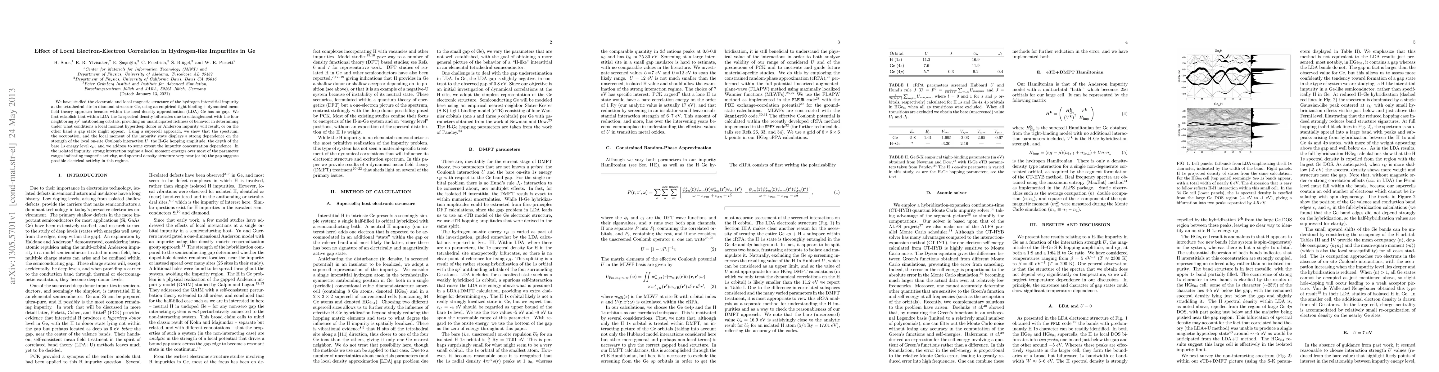 We have studied the electronic and local magnetic structure of the hydrogen interstitial impurity at the tetrahedral site in diamond-structure Ge, using an empirical tight binding + dynamical mean field theory approach because within the local density approximation (LDA) Ge has no gap. We first establish that within LDA the 1s spectral density bifurcates due to entanglement with the four neighboring sp3 antibonding orbitals, providing an unanticipated richness of behavior in determining under what conditions a local moment hyperdeep donor or Anderson impurity will result, or on the other hand a gap state might appear. Using a supercell approach, we show that the spectrum, the occupation, and the local moment of the impurity state displays a strong dependence on the strength of the local on-site Coulomb interaction U, the H-Ge hopping amplitude, the depth of the bare 1s energy level epsilon_H, and we address to some extent the impurity concentration dependence. In the isolated impurity, strong interaction regime a local moment emerges over most of the parameter ranges indicating magnetic activity, and spectral density structure very near (or in) the gap suggests possible electrical activity in this regime.