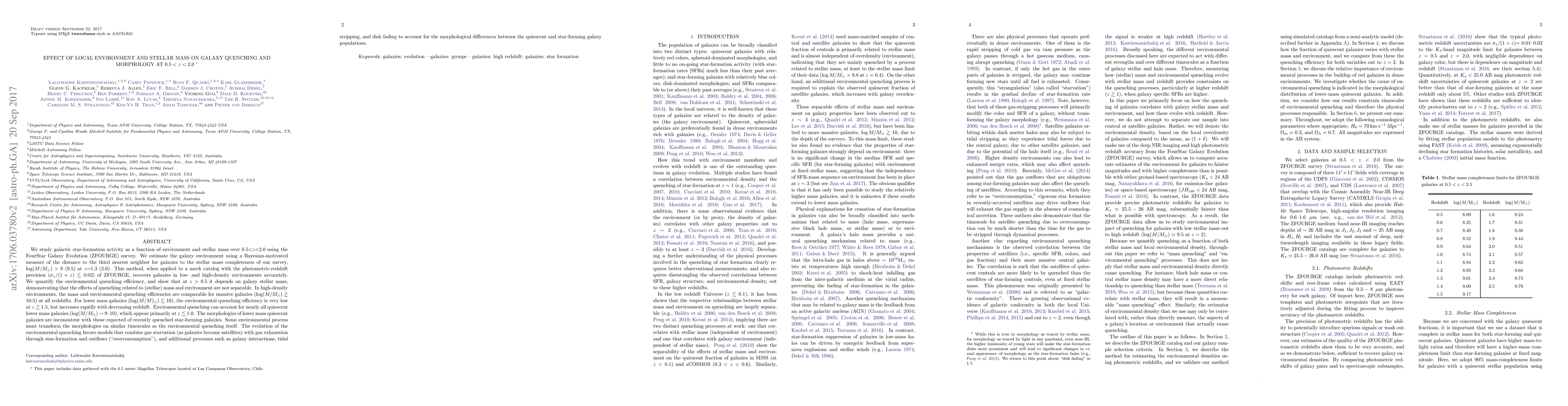 This study examines how galaxy quenching and morphology are influenced by local environment and stellar mass at redshifts 0.5<z<2.0 using the ZFOURGE survey. The research finds that environmental quenching efficiency depends on galaxy stellar mass, with massive galaxies experiencing comparable quenching in high-density environments across all redshifts, while lower mass galaxies show increased quenching efficiency at lower redshifts. Environmental processes also transform the morphology of quenched galaxies, favoring models that combine gas starvation, gas exhaustion, and additional interactions.