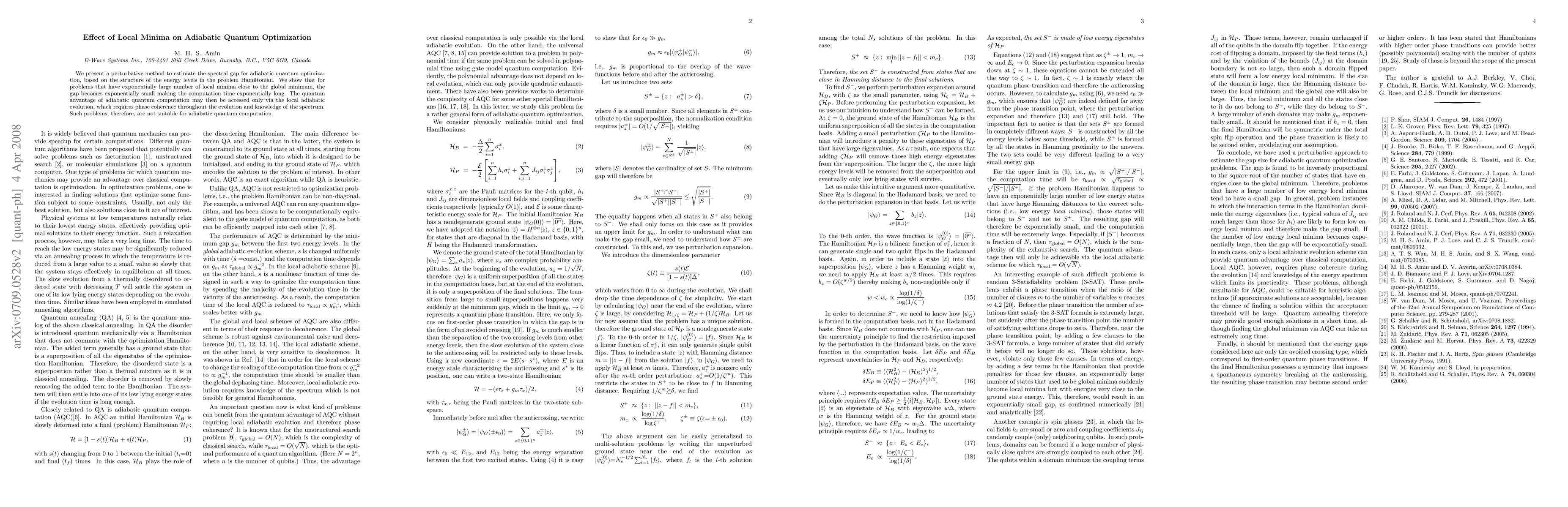 This paper proposes a perturbative method to estimate the spectral gap in adiabatic quantum optimization, revealing that a large number of local minima near the global minimum can exponentially reduce the gap, making computation time prohibitively long. It concludes that such problems are not suitable for adiabatic quantum computation due to the need for phase coherence and spectrum knowledge.