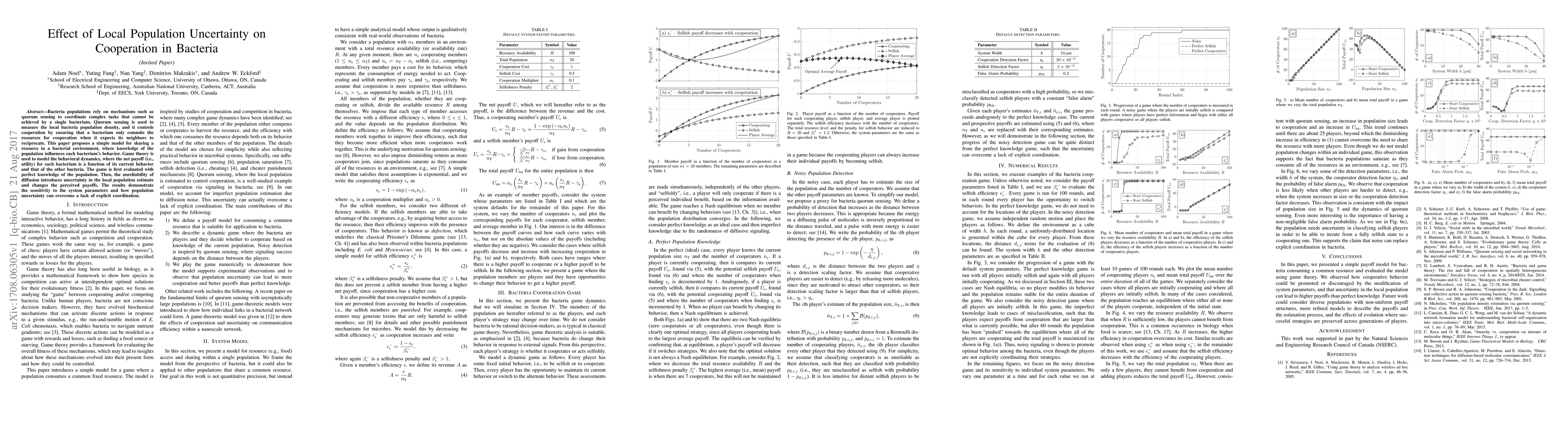 Bacteria populations rely on mechanisms such as quorum sensing to coordinate complex tasks that cannot be achieved by a single bacterium. Quorum sensing is used to measure the local bacteria population density, and it controls cooperation by ensuring that a bacterium only commits the resources for cooperation when it expects its neighbors to reciprocate. This paper proposes a simple model for sharing a resource in a bacterial environment, where knowledge of the population influences each bacterium's behavior. Game theory is used to model the behavioral dynamics, where the net payoff (i.e., utility) for each bacterium is a function of its current behavior and that of the other bacteria. The game is first evaluated with perfect knowledge of the population. Then, the unreliability of diffusion introduces uncertainty in the local population estimate and changes the perceived payoffs. The results demonstrate the sensitivity to the system parameters and how population uncertainty can overcome a lack of explicit coordination.