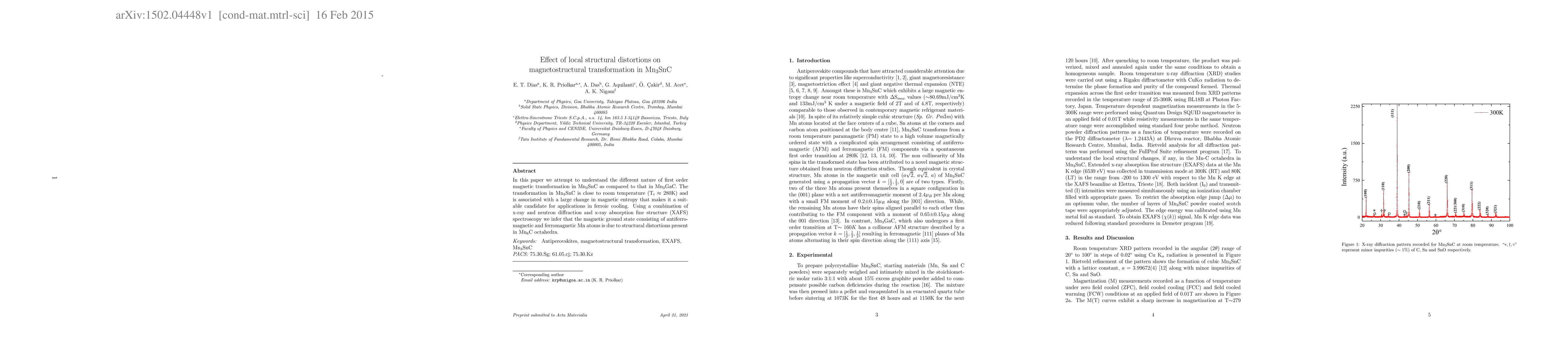 This paper investigates the first-order magnetic transformation in Mn$_3$SnC near room temperature, driven by structural distortions in Mn$_6$C octahedra, which results in a significant magnetic entropy change, making it a potential candidate for ferroic cooling applications. The study employs x-ray and neutron diffraction along with XAFS to elucidate the magnetic ground state.