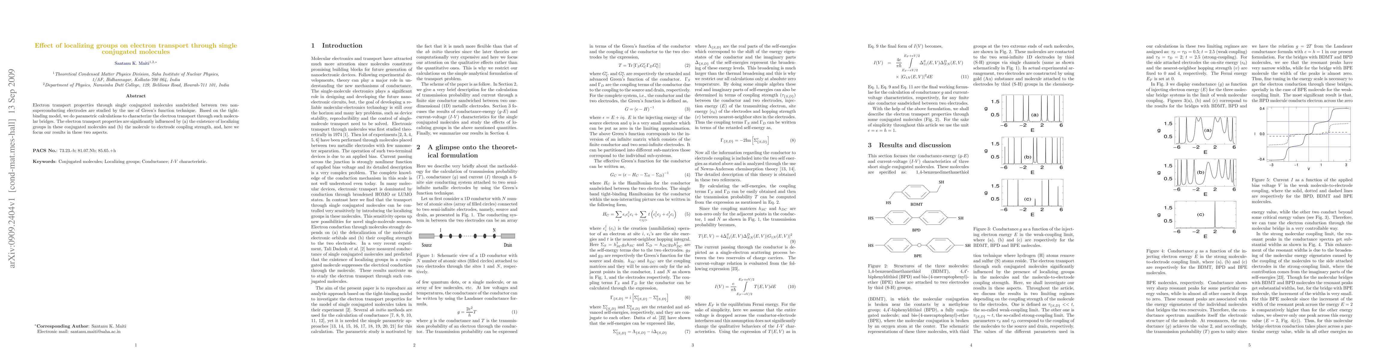 This paper investigates electron transport through single conjugated molecules using Green's function techniques, finding that localizing groups and molecule-electrode coupling strength significantly influence the transport properties. Parametric calculations based on the tight-binding model highlight these effects.