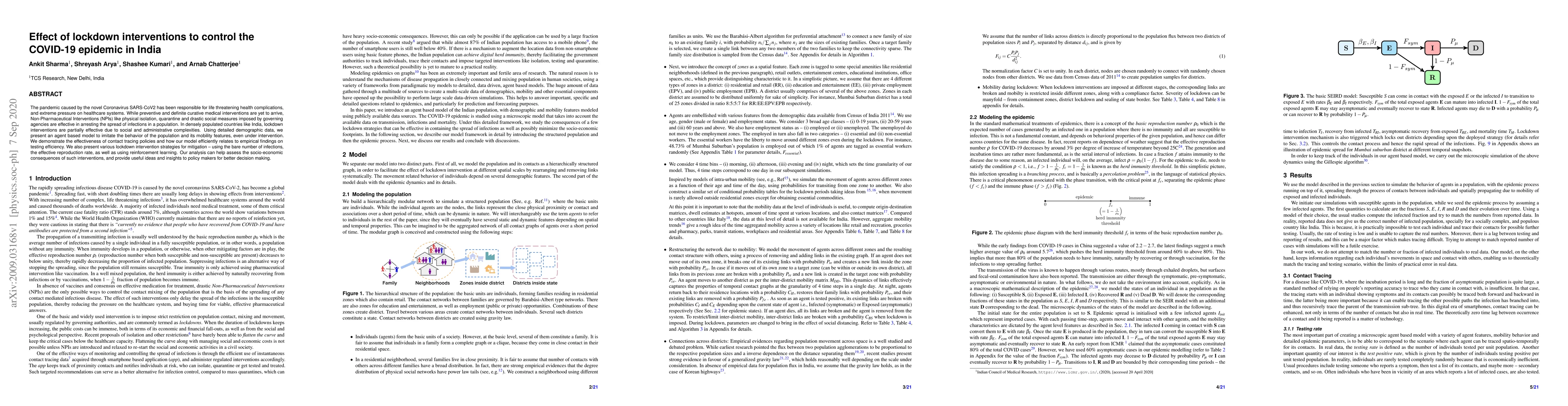 The pandemic caused by the novel Coronavirus SARS-CoV2 has been responsible for life threatening health complications, and extreme pressure on healthcare systems. While preventive and definite curative medical interventions are yet to arrive, Non-Pharmaceutical Interventions (NPIs) like physical isolation, quarantine and drastic social measures imposed by governing agencies are effective in arresting the spread of infections in a population. In densely populated countries like India, lockdown interventions are partially effective due to social and administrative complexities. Using detailed demographic data, we present an agent based model to imitate the behavior of the population and its mobility features, even under intervention. We demonstrate the effectiveness of contact tracing policies and how our model efficiently relates to empirical findings on testing efficiency. We also present various lockdown intervention strategies for mitigation - using the bare number of infections, the effective reproduction rate, as well as using reinforcement learning. Our analysis can help assess the socio-economic consequences of such interventions, and provide useful ideas and insights to policy makers for better decision making.