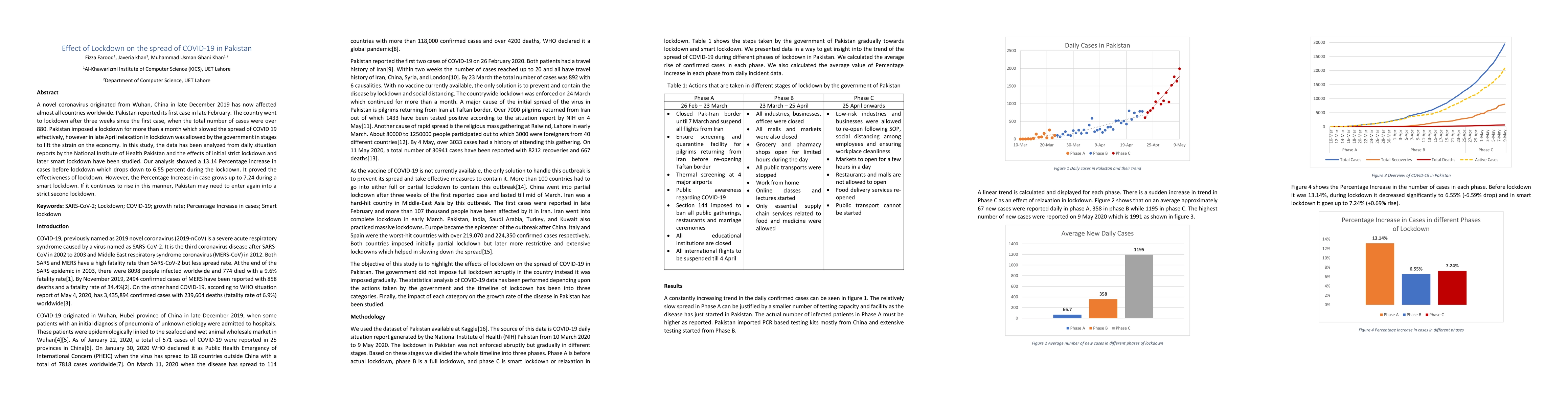 A novel coronavirus originated from Wuhan, China in late December 2019 has now affected almost all countries worldwide. Pakistan reported its first case in late February. The country went to lockdown after three weeks since the first case, when the total number of cases were over 880. Pakistan imposed a lockdown for more than a month which slowed the spread of COVID 19 effectively, however in late April relaxation in lockdown was allowed by the government in stages to lift the strain on the economy. In this study, the data has been analyzed from daily situation reports by the National Institute of Health Pakistan and the effects of initial strict lockdown and later smart lockdown have been studied. Our analysis showed a 13.14 Percentage increase in cases before lockdown which drops down to 6.55 percent during the lockdown. It proved the effectiveness of lockdown. However, the Percentage Increase in case grows up to 7.24 during a smart lockdown. If it continues to rise in this manner, Pakistan may need to enter again into a strict second lockdown.
