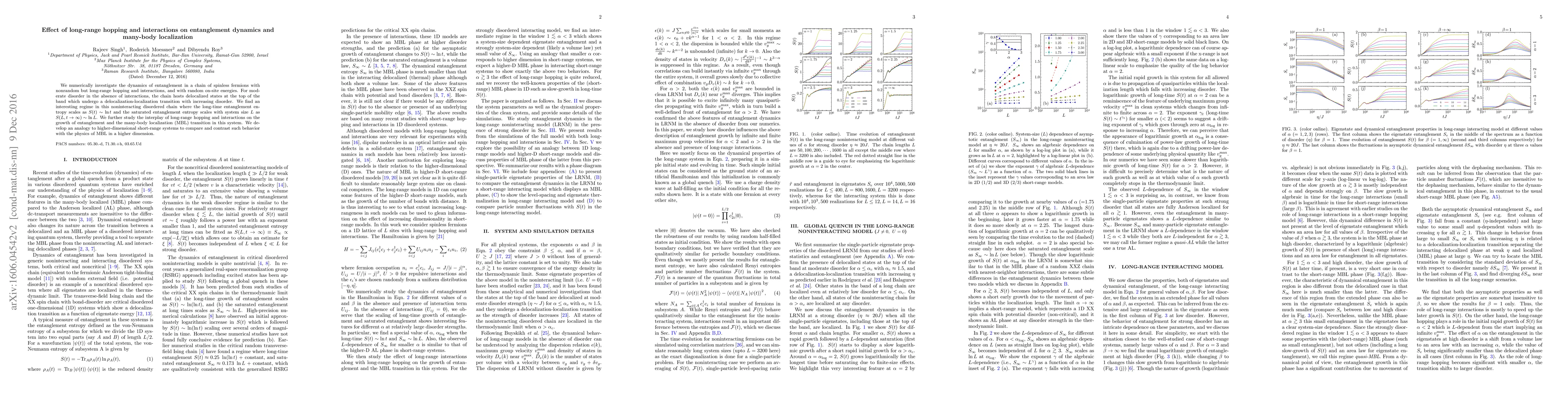 This paper numerically explores entanglement dynamics in spinless fermion chains with long-range hopping and interactions, alongside random on-site energies, revealing a unique scaling regime for entanglement entropy. The study also investigates how long-range interactions influence many-body localization transitions.