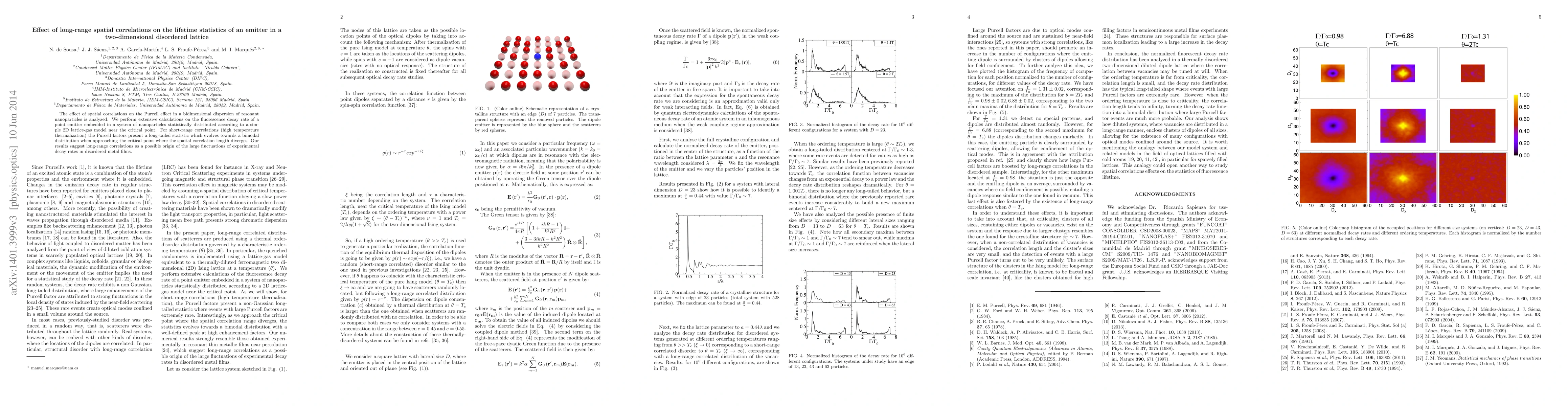 The effect of spatial correlations on the Purcell effect in a bidimensional dispersion of resonant nanoparticles is analyzed. We perform extensive calculations on the fluorescence decay rate of a point emitter embedded in a system of nanoparticles statistically distributed according to a simple 2D lattice-gas model near the critical point. For short-range correlations (high temperature thermalization) the Purcell factors present a long-tailed statistic which evolves towards a bimodal distribution when approaching the critical point where the spatial correlation length diverges. Our results suggest long-range correlations as a possible origin of the large fluctuations of experimental decay rates in disordered metal films.