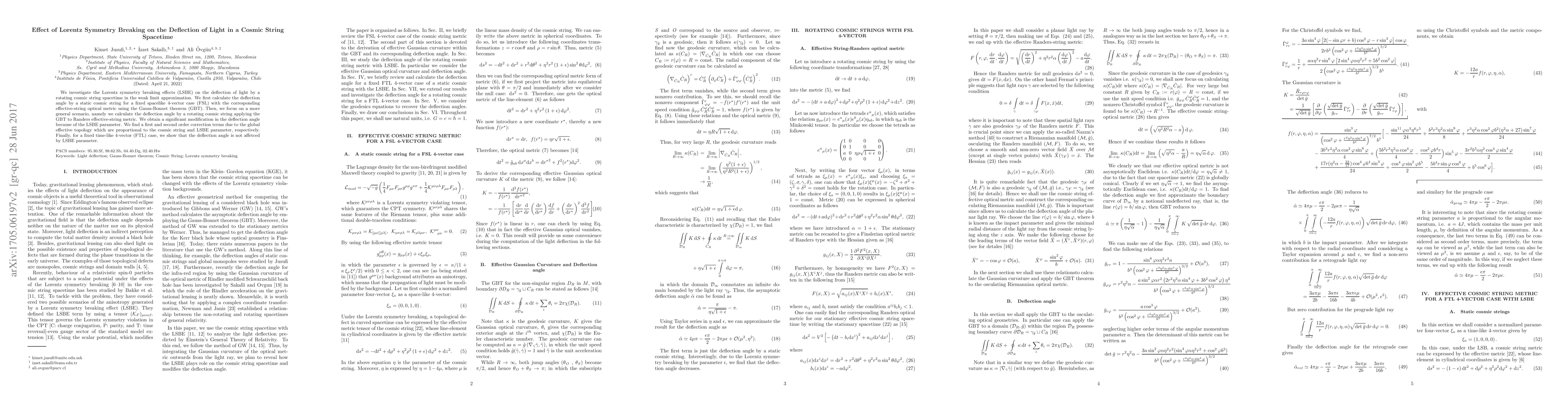 We investigate the Lorentz symmetry breaking effects (LSBE) on the deflection of light by a rotating cosmic string spacetime in the weak limit approximation. We first calculate the deflection angle by a static cosmic string for a fixed spacelike 4-vector case (FSL) with the corresponding effective-string optical metric using the Gauss-Bonnet theorem (GBT). Then, we focus on a more general scenario, namely we calculate the deflection angle by a rotating cosmic string applying the GBT to Randers effective-string metric. We obtain a significant modification in the deflection angle because of the LSBE parameter. We find a first and second order correction terms due to the global effective topology which are proportional to the cosmic string and LSBE parameter, respectively. Finally, for a fixed time-like 4-vector (FTL) case, we show that the deflection angle is not affetced by LSBE parameter.
