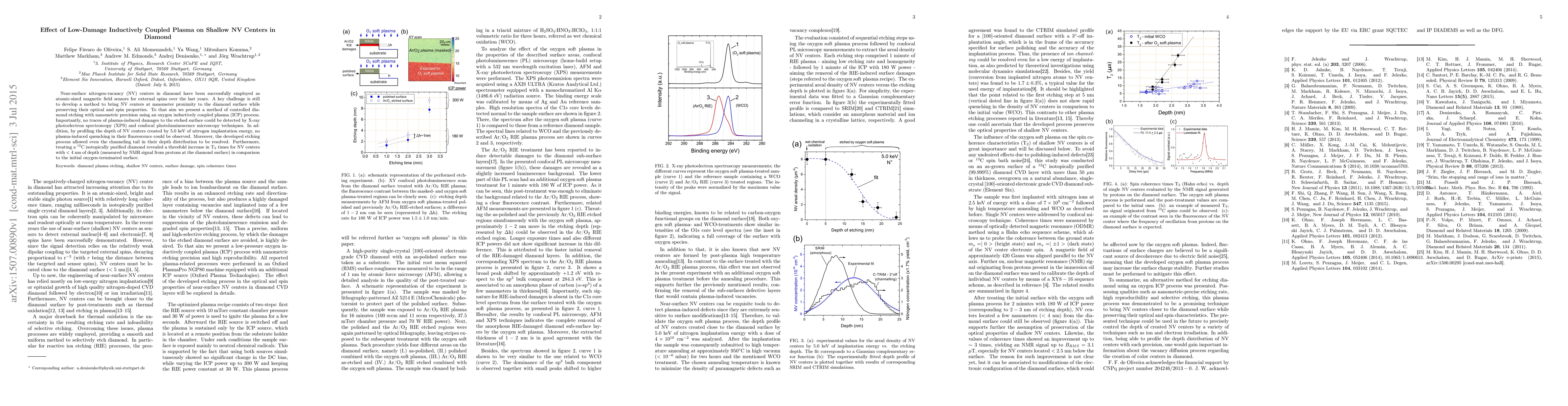 This study presents a low-damage inductively coupled plasma (ICP) etching method to position NV centers near the diamond surface without compromising their optical and spin properties. The technique preserves NV centers' fluorescence and enhances T2 times for NV centers within 4 nm of the surface.