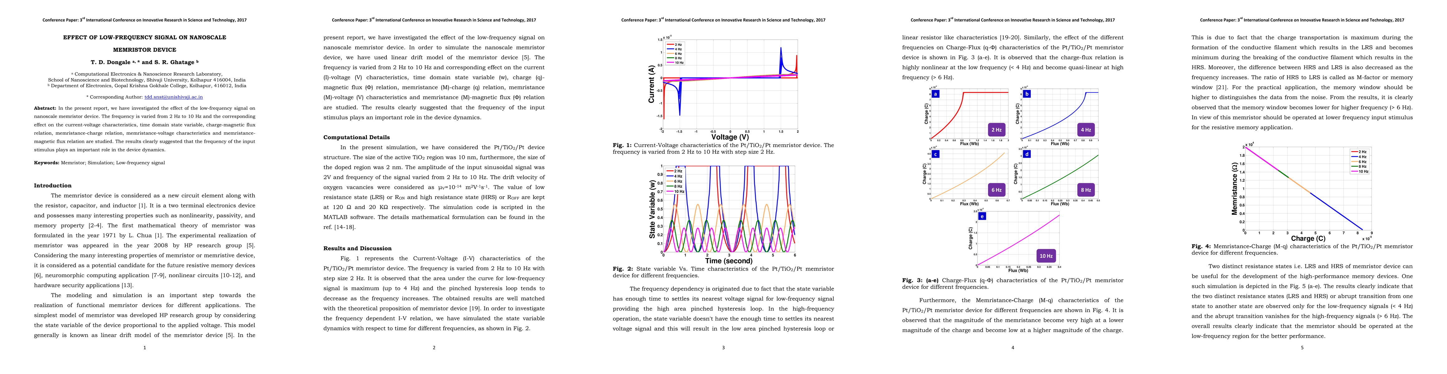 In the present report, we have investigated the effect of the low-frequency signal on nanoscale memristor device. The frequency is varied from 2 Hz to 10 Hz and the corresponding effect on the current-voltage characteristics, time domain state variable, charge-magnetic flux relation, memristance-charge relation, memristance-voltage characteristics and memristance-magnetic flux relation are studied. The results clearly suggested that the frequency of the input stimulus plays an important role in the device dynamics.