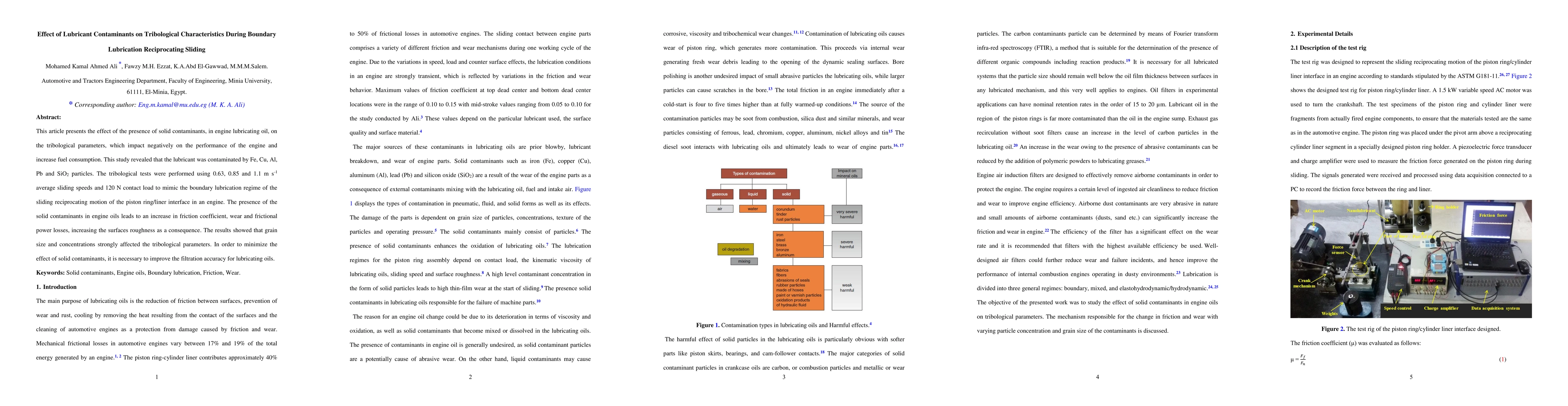 This article presents the effect of the presence of solid contaminants, in engine lubricating oil, on the tribological parameters, which impact negatively on the performance of the engine and increase fuel consumption. This study revealed that the lubricant was contaminated by Fe, Cu, Al, Pb and SiO2 particles. The tribological tests were performed using 0.63, 0.85 and 1.1 m s-1 average sliding speeds and 120 N contact load to mimic the boundary lubrication regime of the sliding reciprocating motion of the piston ring/liner interface in an engine. The presence of the solid contaminants in engine oils leads to an increase in friction coefficient, wear and frictional power losses, increasing the surfaces roughness as a consequence. The results showed that grain size and concentrations strongly affected the tribological parameters. In order to minimize the effect of solid contaminants, it is necessary to improve the filtration accuracy for lubricating oils.