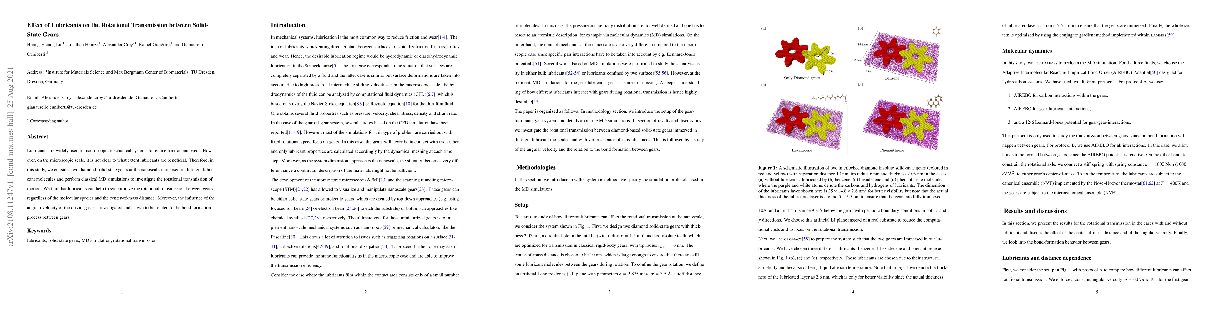 This study investigates the impact of lubricants on the rotational transmission between nanoscale diamond solid-state gears using classical MD simulations. Results show that lubricants enhance synchronization of rotational motion irrespective of the lubricant type and distance between gears, with angular velocity influencing bond formation between gears.