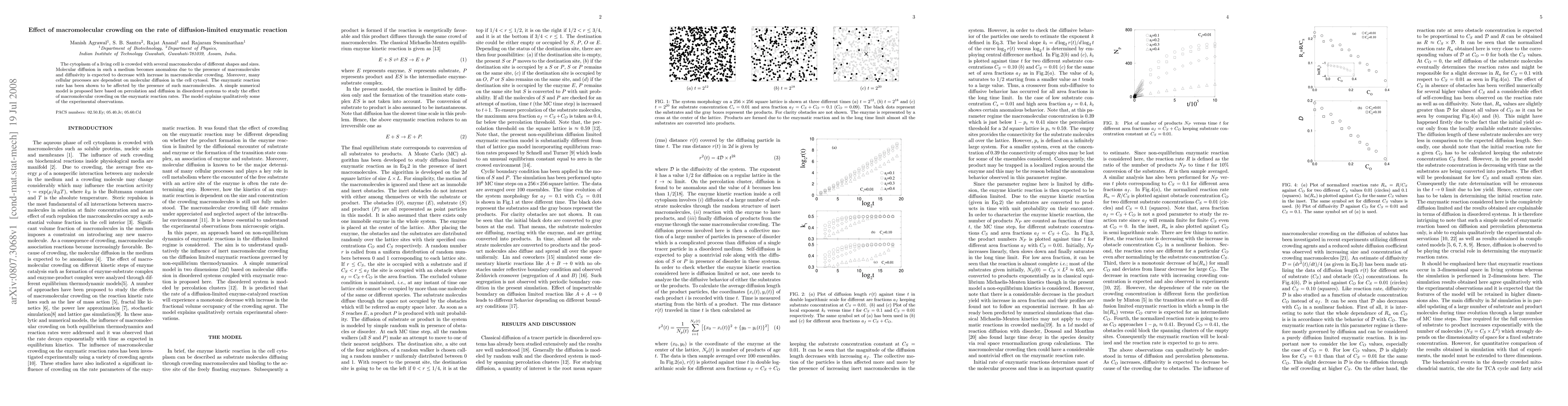 The cytoplasm of a living cell is crowded with several macromolecules of different shapes and sizes. Molecular diffusion in such a medium becomes anomalous due to the presence of macromolecules and diffusivity is expected to decrease with increase in macromolecular crowding. Moreover, many cellular processes are dependent on molecular diffusion in the cell cytosol. The enzymatic reaction rate has been shown to be affected by the presence of such macromolecules. A simple numerical model is proposed here based on percolation and diffusion in disordered systems to study the effect of macromolecular crowding on the enzymatic reaction rates. The model explains qualitatively some of the experimental observations.