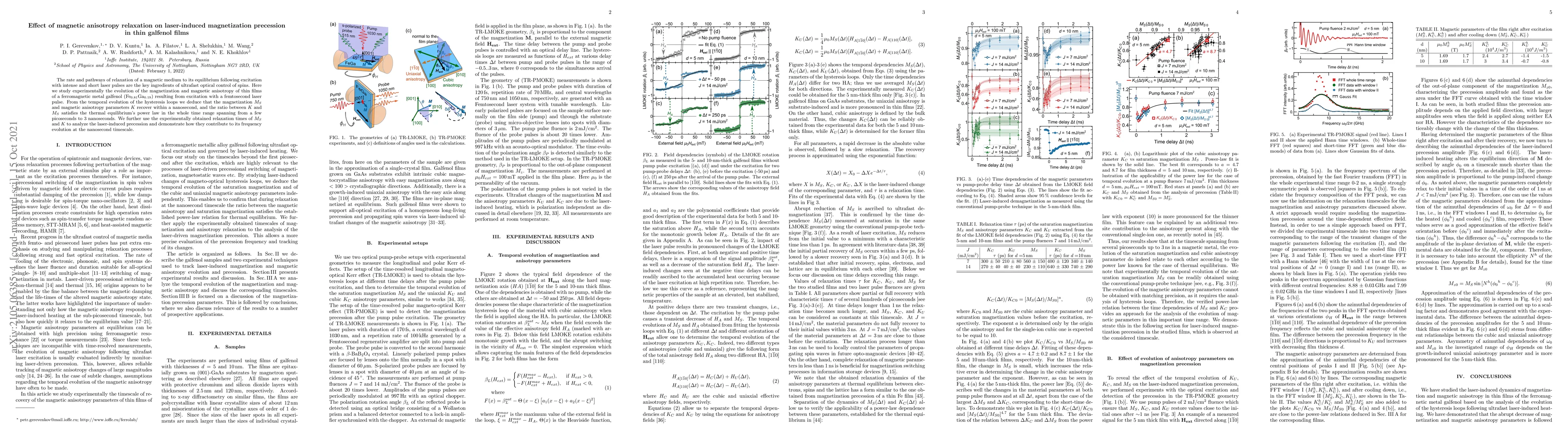 This study experimentally investigates the relaxation dynamics of thin galfenol films following femtosecond laser pulse excitation, finding that the magnetization and magnetic anisotropy recover within a nanosecond. The analysis reveals how these relaxation processes influence the frequency evolution of laser-induced magnetization precession at the nanosecond timescale.