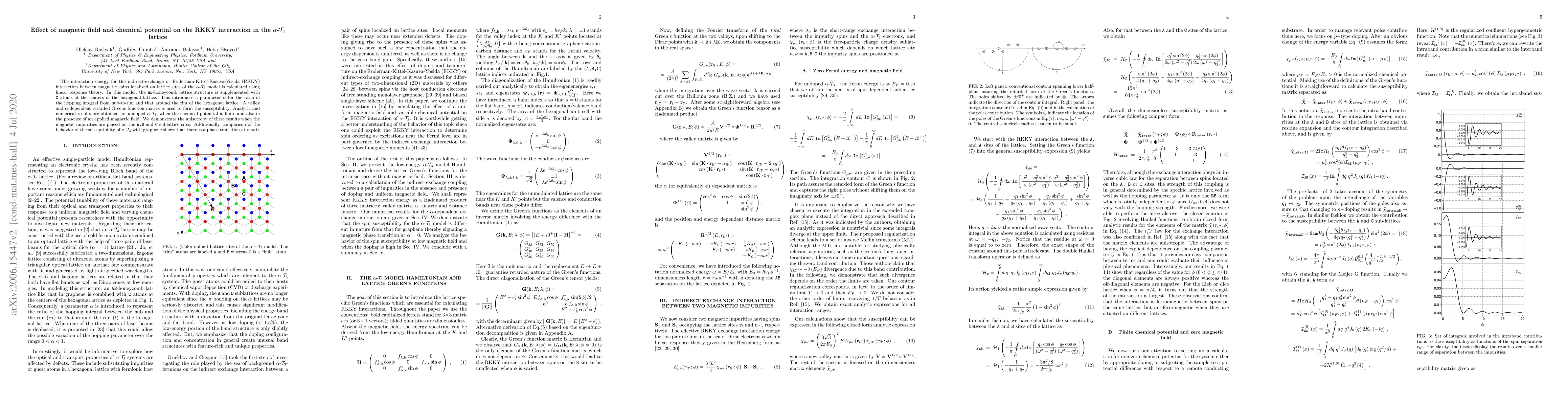 The interaction energy for the indirect-exchange or Ruderman-Kittel-Kasuva-Yosida (RKKY) interaction between magnetic spins localized on lattice sites of the $\alpha$-${\cal T}_3$ model is calculated using linear response theory. In this model, the $\texttt{AB}$-honeycomb lattice structure is supplemented with $\texttt{C}$ atoms at the centers of the hexagonal lattice. This introduces a parameter $\alpha$ for the ratio of the hopping integral from hub-to-rim and that around the rim of the hexagonal lattice. A valley and $\alpha$-dependent retarded Greens function matrix is used to form the susceptibility. Analytic and numerical results are obtained for undoped $\alpha$-${\cal T}_3$, when the chemical potential is finite and also in the presence of an applied magnetic field. We demonstrate the anisotropy of these results when the magnetic impurities are placed on the $\texttt{A,B}$ and $\texttt{C}$ sublattice sites. Additionally, comparison of the behavior of the susceptibility of $\alpha$-${\cal T}_3$ with graphene shows that there is a phase transition at $\alpha=0$.