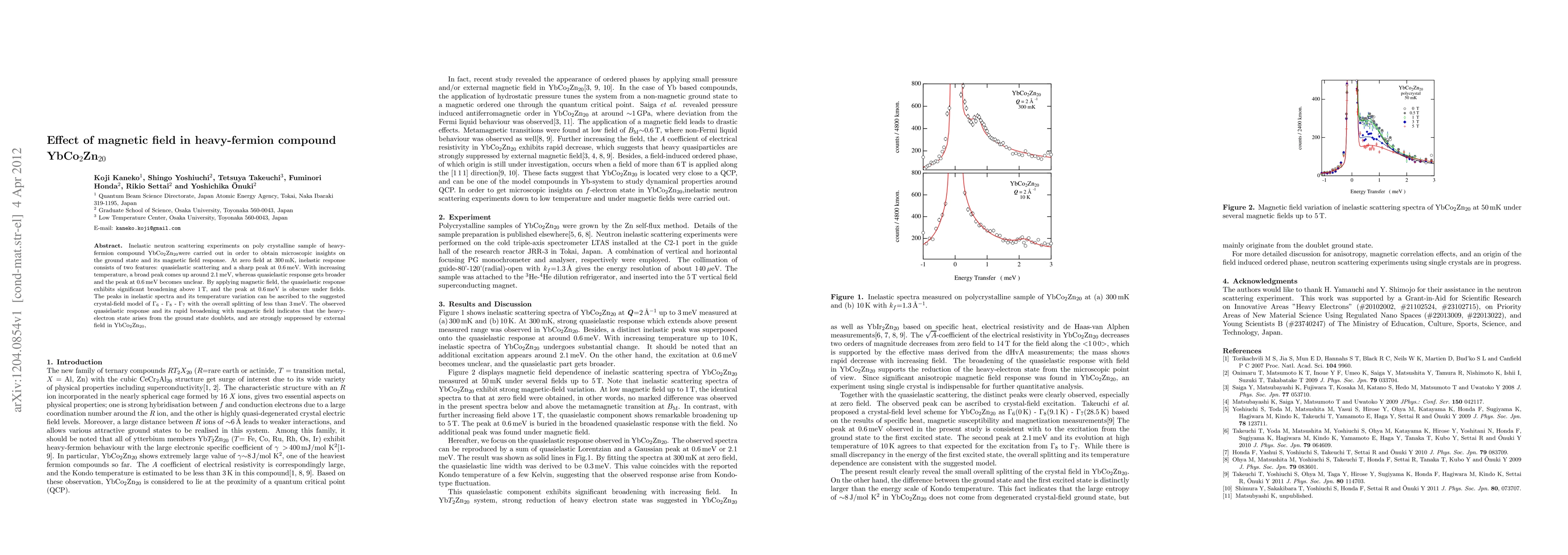 Inelastic neutron scattering experiments on poly crystalline sample of heavy-fermion compound YbCo$_2$Zn$_{20}$ were carried out in order to obtain microscopic insights on the ground state and its magnetic field response. At zero field at 300 mK, inelastic response consists of two features: quasielastic scattering and a sharp peak at 0.6 meV. With increasing temperature, a broad peak comes up around 2.1 meV, whereas quasielastic response gets broader and the peak at 0.6 meV becomes unclear. By applying magnetic field, the quasielastic response exhibits significant broadening above 1 T, and the peak at 0.6 meV is obscure under fields. The peaks in inelastic spectra and its temperature variation can be ascribed to the suggested crystal-field model of ${{\Gamma}_6}$ - ${{\Gamma}_8}$ - ${{\Gamma}_7}$ with the overall splitting of less than 3 meV. The observed quasielastic response and its rapid broadening with magnetic field indicates that the heavy-electron state arises from the ground state doublets, and are strongly suppressed by external field in YbCo$_2$Zn$_{20}$.