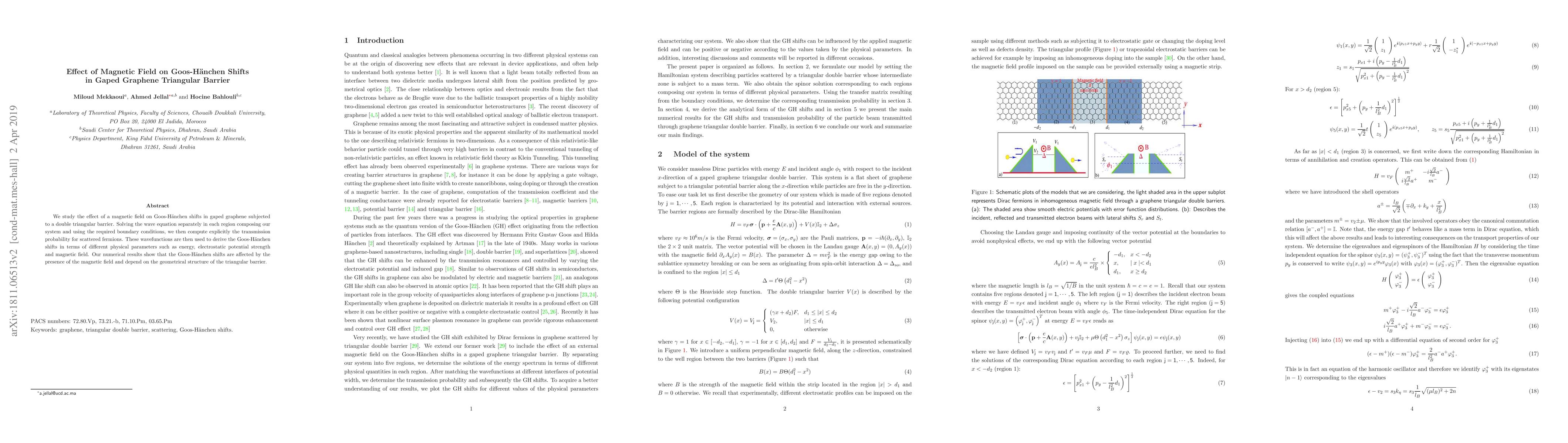 This research investigates how magnetic fields influence the Goos-Hänchen shifts in gaped graphene through a double triangular barrier, revealing that shifts depend on energy, electrostatic potential, and the magnetic field, with variations tied to the barrier's geometry.