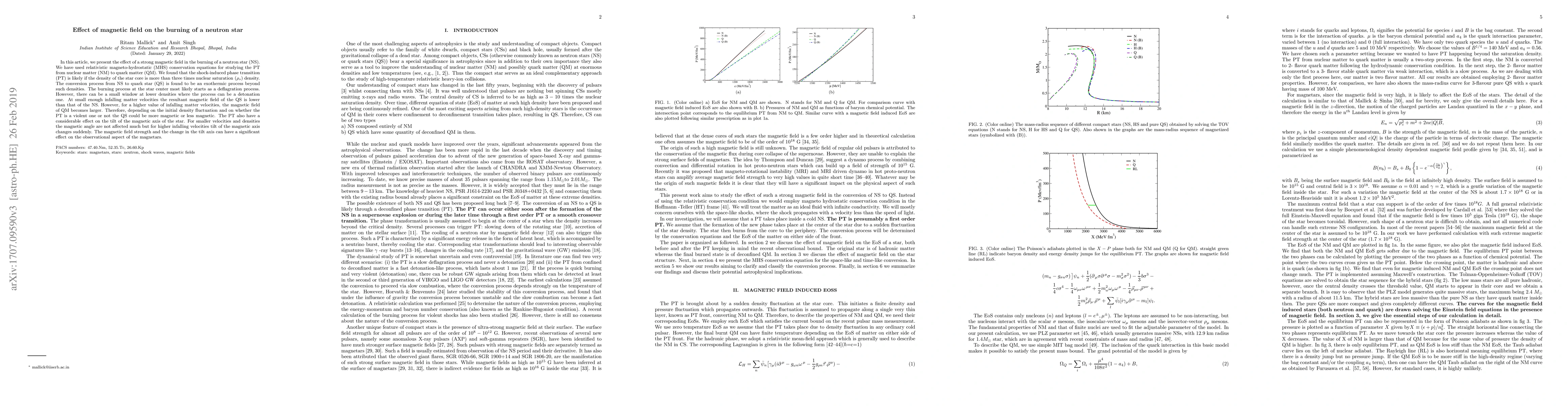 In this article, we present the effect of a strong magnetic field in the burning of a neutron star (NS). We have used relativistic magneto-hydrostatic (MHS) conservation equations for studying the PT from nuclear matter (NM) to quark matter (QM). We found that the shock-induced phase transition (PT) is likely if the density of the star core is more than three times nuclear saturation ($\rho_s$) density. The conversion process from NS to quark star (QS) is found to be an exothermic process beyond such densities. The burning process at the star center most likely starts as a deflagration process. However, there can be a small window at lower densities where the process can be a detonation one. At small enough infalling matter velocities the resultant magnetic field of the QS is lower than that of the NS. However, for a higher value of infalling matter velocities, the magnetic field of QM becomes larger. Therefore, depending on the initial density fluctuation and on whether the PT is a violent one or not the QS could be more magnetic or less magnetic. The PT also have a considerable effect on the tilt of the magnetic axis of the star. For smaller velocities and densities the magnetic angle are not affected much but for higher infalling velocities tilt of the magnetic axis changes suddenly. The magnetic field strength and the change in the tilt axis can have a significant effect on the observational aspect of the magnetars.
