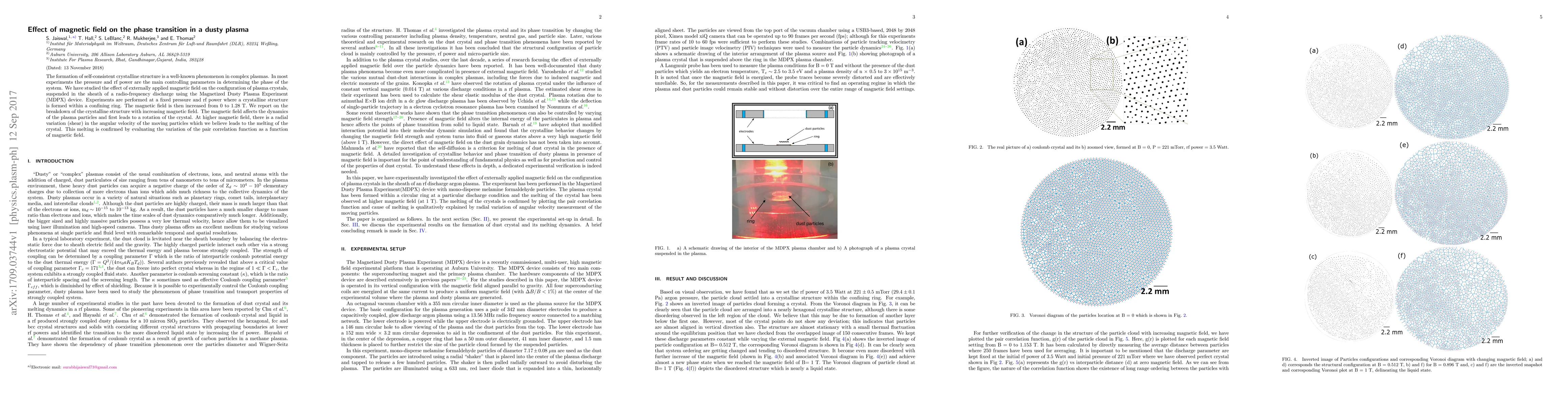 This study investigates how an externally applied magnetic field influences the phase transition in plasma crystals within a radio-frequency discharge, revealing that increasing magnetic fields cause the crystalline structure to rotate and eventually melt, confirmed by changes in the pair correlation function.