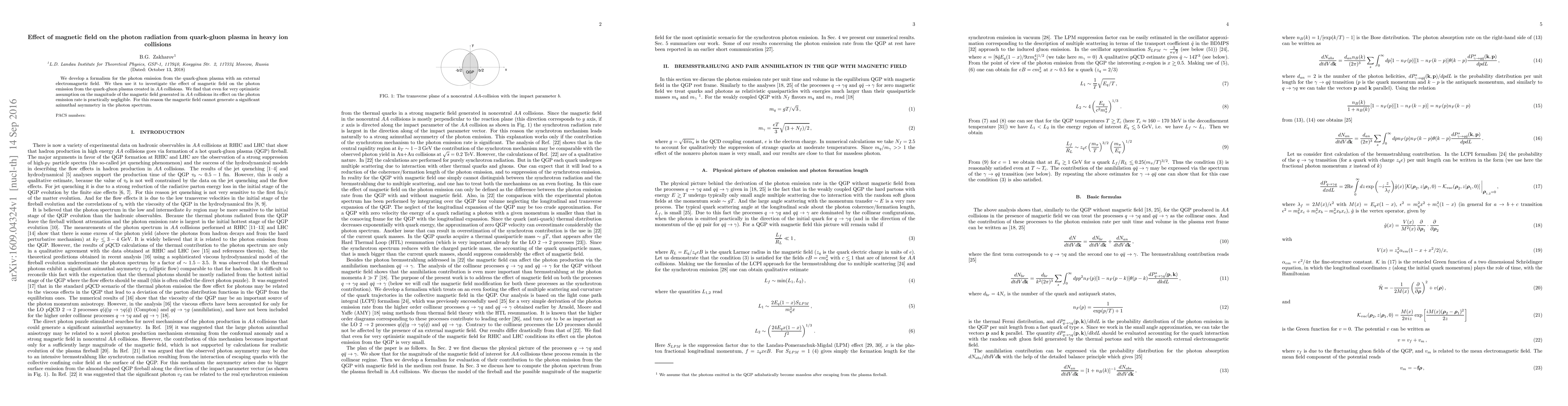 We develop a formalism for the photon emission from the quark-gluon plasma with an external electromagnetic field. We then use it to investigate the effect of magnetic field on the photon emission from the quark-gluon plasma created in $AA$ collisions. We find that even for very optimistic assumption on the magnitude of the magnetic field generated in $AA$ collisions its effect on the photon emission rate is practically negligible. For this reason the magnetic field cannot generate a significant azimuthal asymmetry in the photon spectrum.