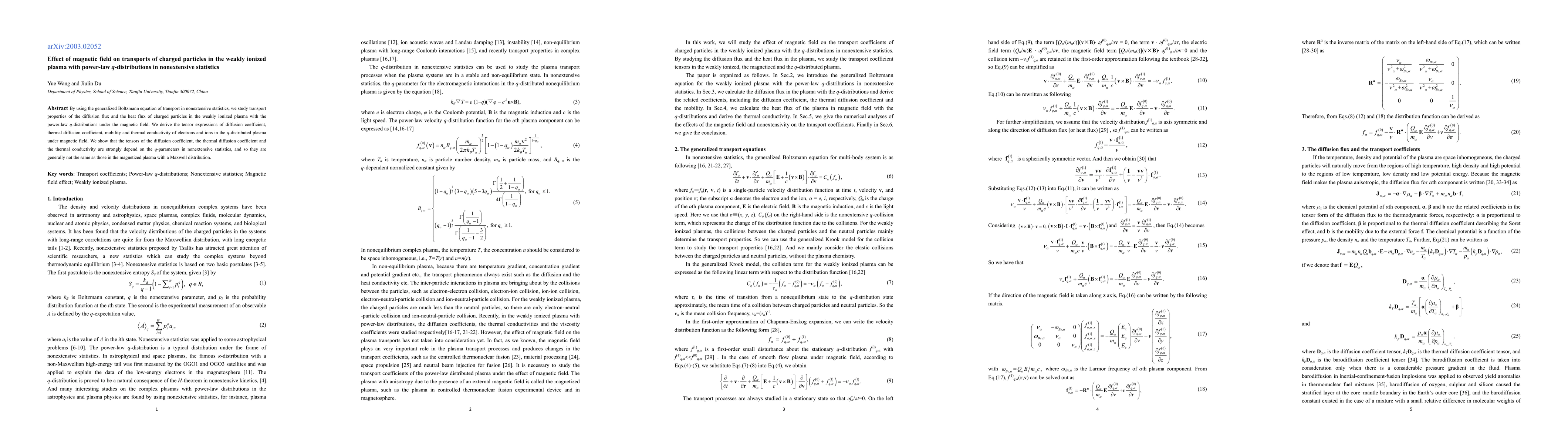 This paper investigates the transport properties of charged particles in weakly ionized plasmas with power-law q-distributions under magnetic fields, using the generalized Boltzmann equation in nonextensive statistics. It derives tensor expressions for diffusion, thermal diffusion, mobility, and thermal conductivity, showing significant dependence on q-parameters, differing from results in plasmas with Maxwell distributions.