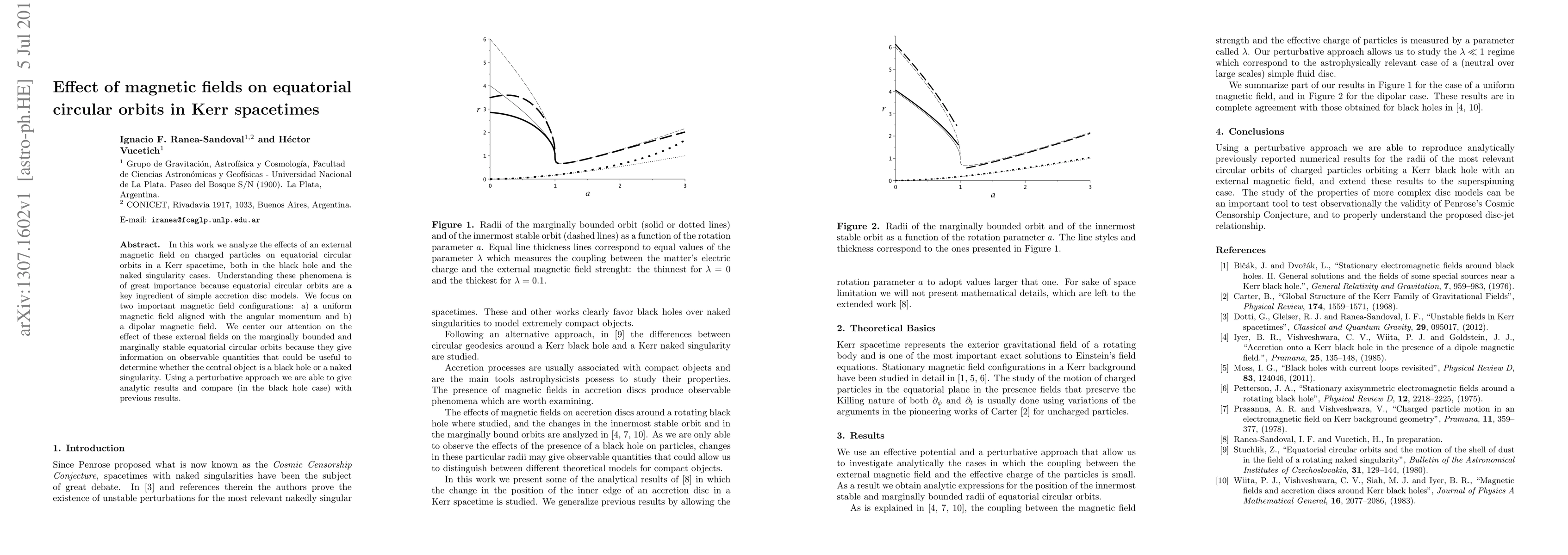 This work builds upon and extends previous studies by focusing on the effects of magnetic fields on equatorial circular orbits in Kerr spacetimes, specifically addressing both black hole and naked singularity cases, and offering analytic results for two distinct magnetic field configurations.