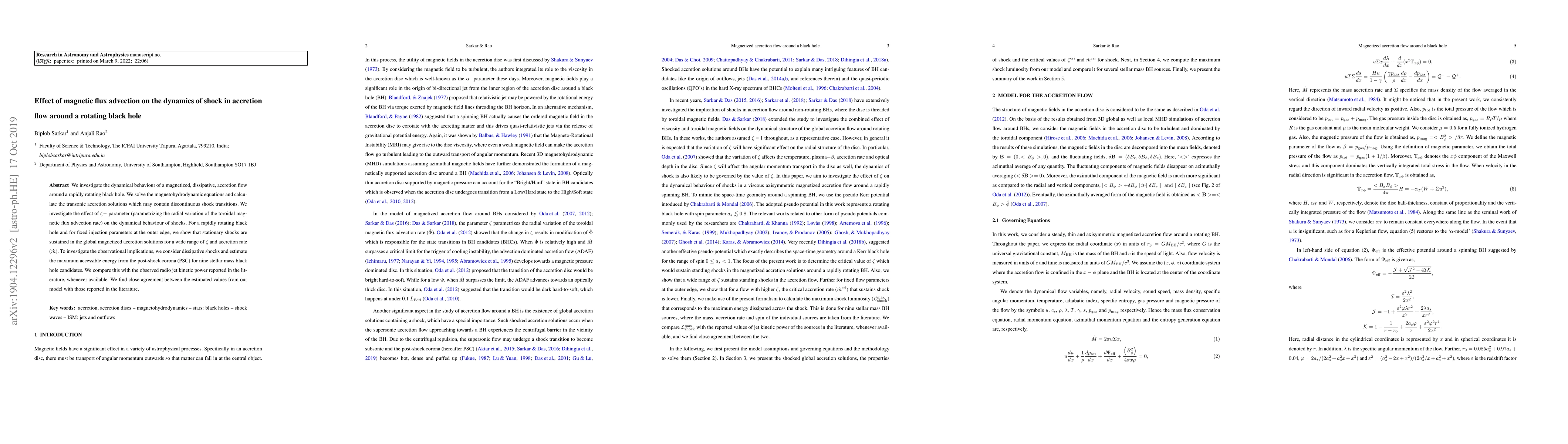 We investigate the dynamical behaviour of a magnetized, dissipative, accretion flow around a rapidly rotating black hole. We solve the magnetohydrodynamic equations and calculate the transonic accretion solutions which may contain discontinuous shock transitions. We investigate the effect of $\zeta-$ parameter (parametrizing the radial variation of the toroidal magnetic flux advection rate) on the dynamical behaviour of shocks. For a rapidly rotating black hole and for fixed injection parameters at the outer edge, we show that stationary shocks are sustained in the global magnetized accretion solutions for a wide range of $\zeta$ and accretion rate ($\dot{m}$). To investigate the observational implications, we consider dissipative shocks and estimate the maximum accessible energy from the post-shock corona (PSC) for nine stellar mass black hole candidates. We compare this with the observed radio jet kinetic power reported in the literature, whenever available. We find close agreement between the estimated values from our model with those reported in the literature.