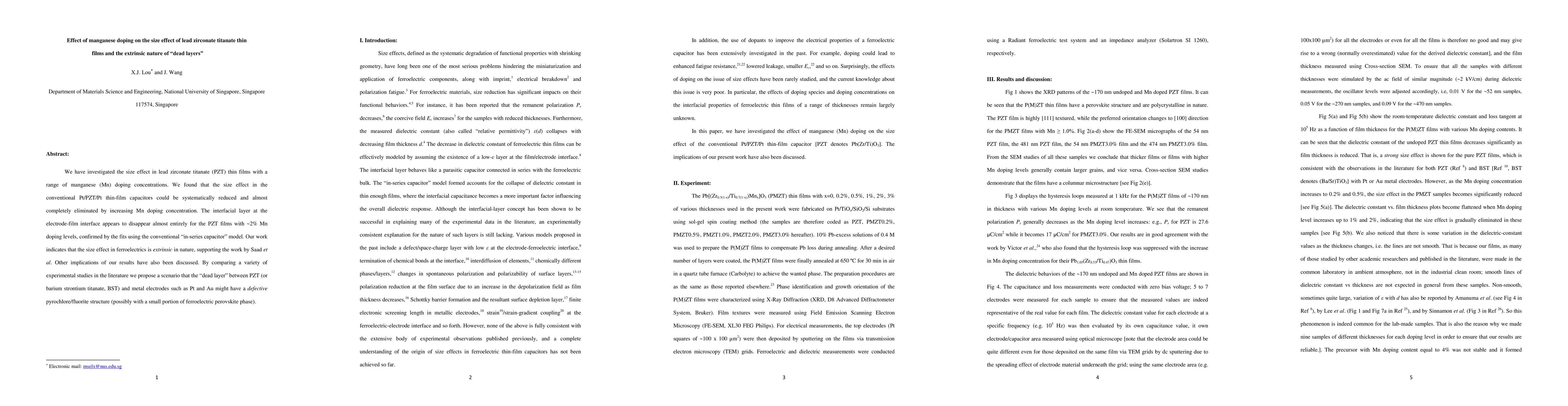 This paper investigates the impact of manganese doping on the size effect in lead zirconate titanate (PZT) thin films, revealing that increased Mn doping can eliminate the size effect and the extrinsic dead layer at the electrode-film interface, suggesting a defective pyrochlore/fluorite structure in the dead layer.