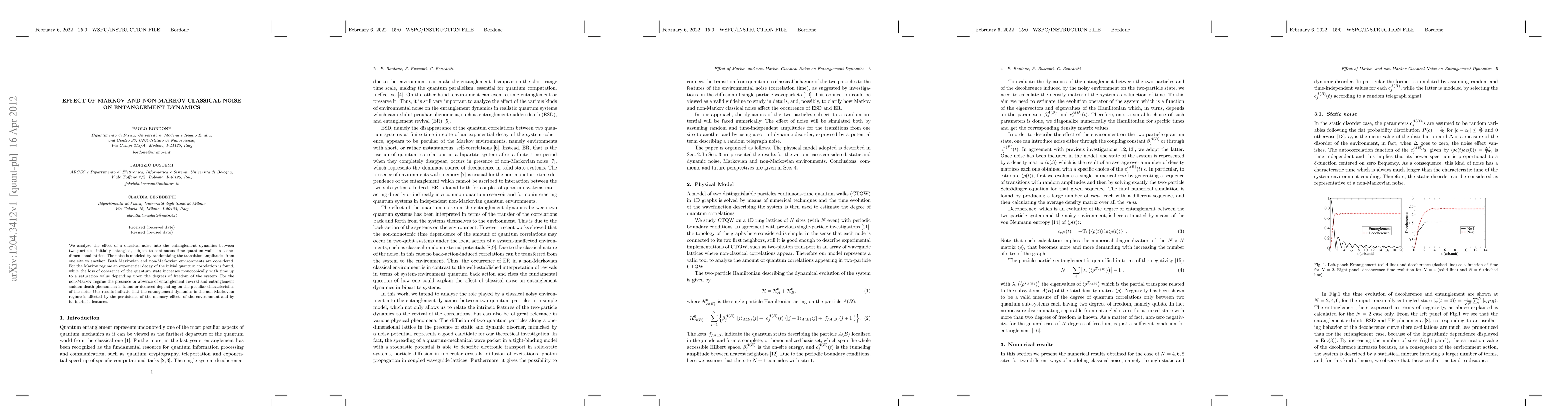 This paper investigates the impact of classical noise on the entanglement dynamics of two initially entangled particles undergoing continuous time quantum walks. It finds that Markovian noise leads to exponential decay of entanglement, while non-Markovian noise can cause entanglement revival or sudden death, influenced by memory effects and environmental characteristics.