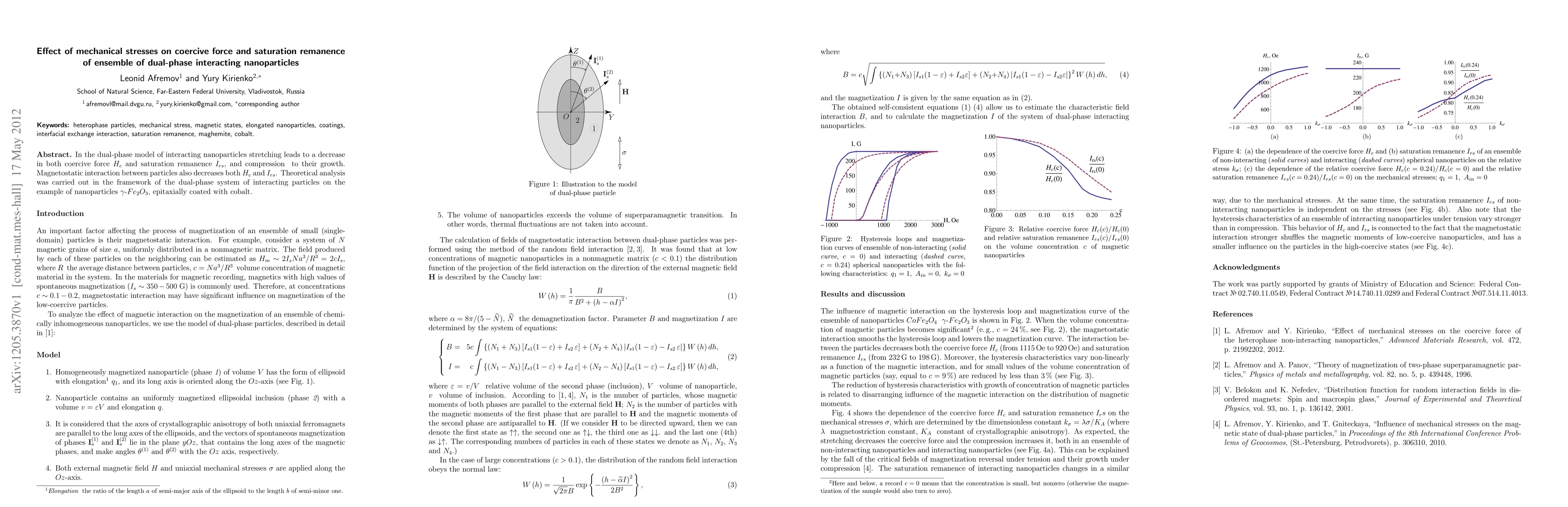 The research examines the impact of mechanical stresses on the magnetic properties of dual-phase nanoparticles, finding that stretching reduces coercive force and saturation remanence, while compression increases them. Magnetostatic interaction between particles similarly decreases both properties. The study uses $gamma$-$Fe_2O_3$ nanoparticles coated with cobalt as a model system.