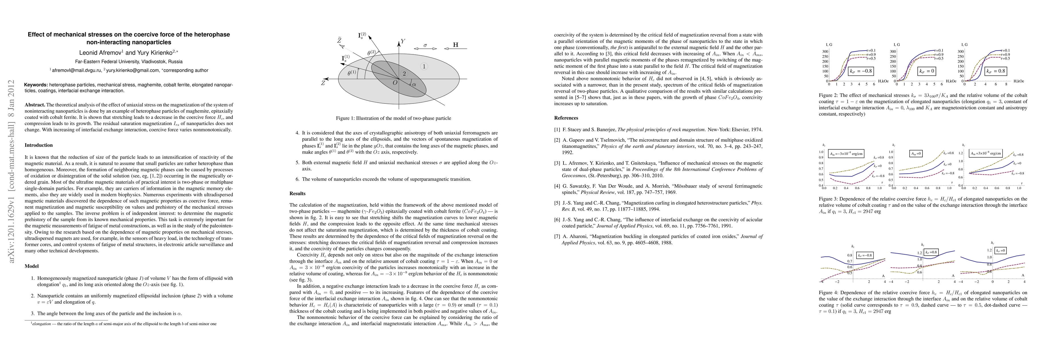 The theoretical analysis of the effect of uniaxial stress on the magnetization of the system of noninteracting nanoparticles is done by an example of heterophase particles of maghemite, epitaxially coated with cobalt ferrite. It is shown that stretching leads to a decrease in the coercive force $H_c$, and compression leads to its growth. The residual saturation magnetization $I_{rs}$ of nanoparticles does not change. With increasing of interfacial exchange interaction, coercive force varies nonmonotonically