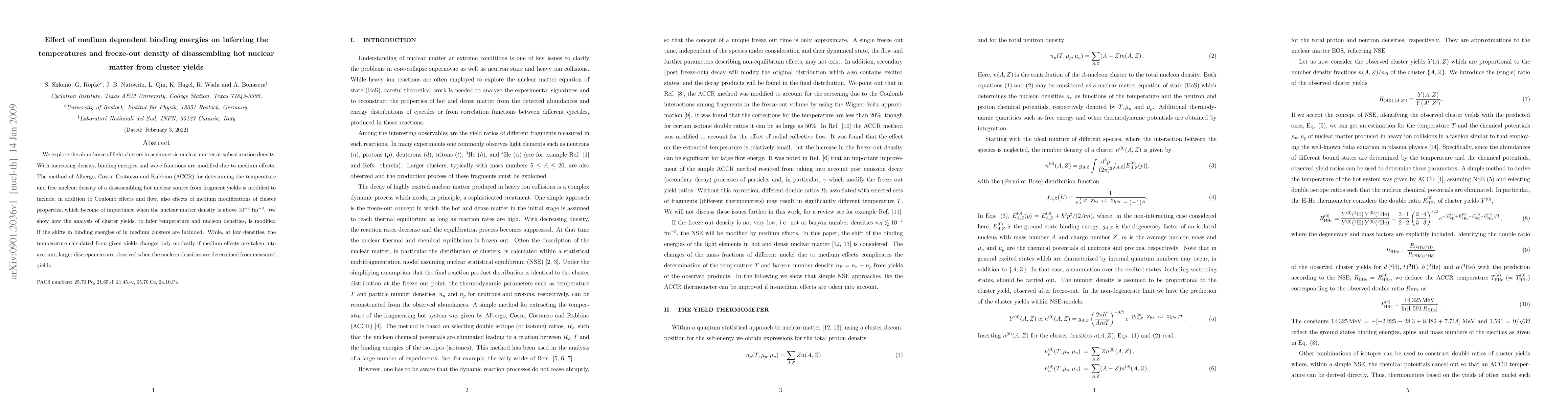 We explore the abundance of light clusters in asymmetric nuclear matter at subsaturation density. With increasing density, binding energies and wave functions are modified due to medium effects. The method of Albergo, Costa, Costanzo and Rubbino (ACCR) for determining the temperature and free nucleon density of a disassembling hot nuclear source from fragment yields is modified to include, in addition to Coulomb effects and flow, also effects of medium modifications of cluster properties, which become of importance when the nuclear matter density is above 10$^{-3}$ fm$^{-3}$. We show how the analysis of cluster yields, to infer temperature and nucleon densities, is modified if the shifts in binding energies of in medium clusters are included. While, at low densities, the temperature calculated from given yields changes only modestly if medium effects are taken into account, larger discrepancies are observed when the nucleon densities are determined from measured yields.