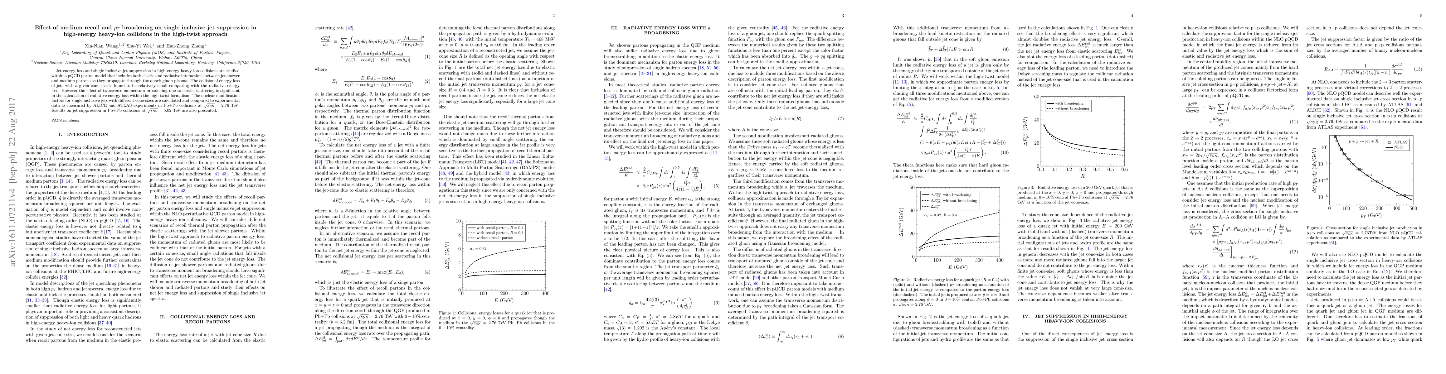 This paper investigates jet energy loss and suppression in high-energy heavy-ion collisions using a pQCD parton model, finding that while collisional energy loss is minor, transverse momentum broadening from elastic scattering significantly impacts radiative energy loss calculations. Results are compared to ALICE and ATLAS experimental data for Pb+Pb collisions at different energies.
