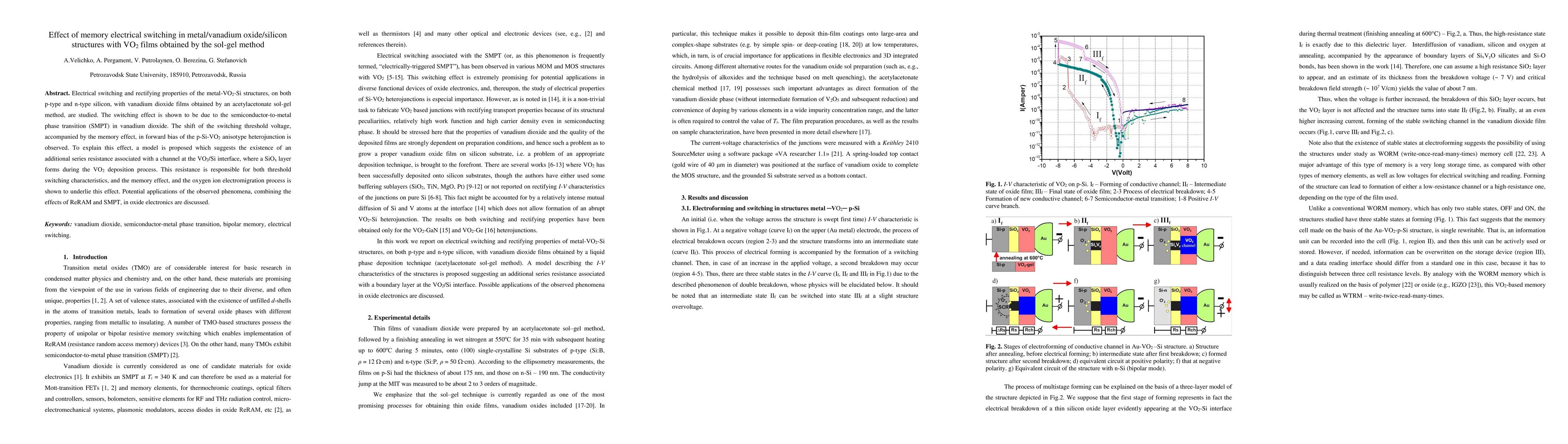 This paper investigates the electrical switching and rectifying properties in metal/vanadium oxide/silicon structures, attributing the switching effect to the semiconductor-to-metal phase transition in vanadium dioxide. A proposed model explains the threshold voltage shift and memory effect via oxygen ion electromigration and series resistance at the VO2/Si interface.
