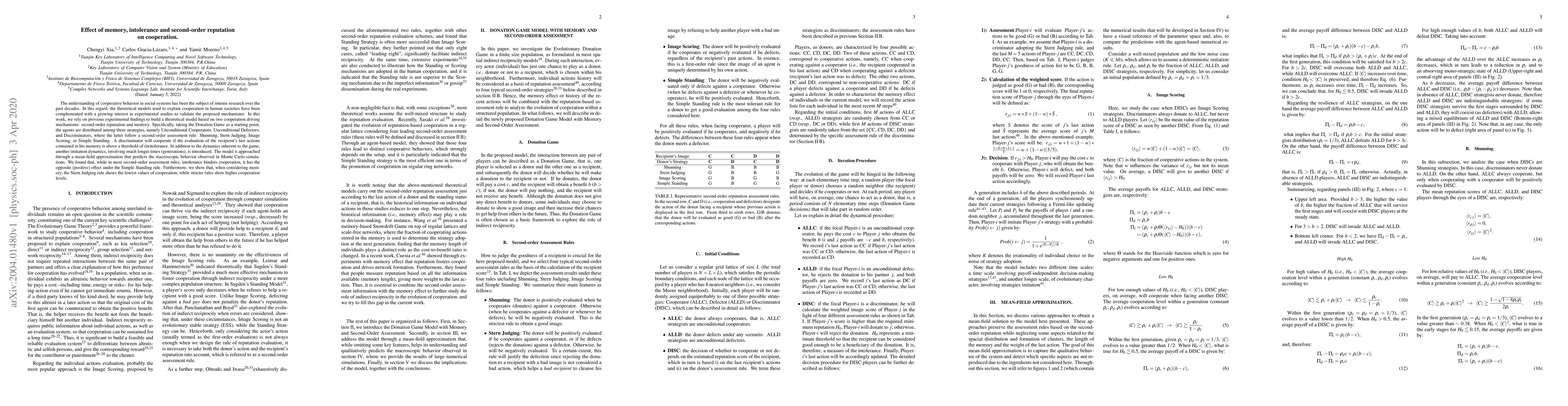 The understanding of cooperative behavior in social systems has been the subject of intense research over the past decades. In this regard, the theoretical models used to explain cooperation in human societies have been complemented with a growing interest in experimental studies to validate the proposed mechanisms. In this work, we rely on previous experimental findings to build a theoretical model based on two cooperation driving mechanisms: second-order reputation and memory. Specifically, taking the Donation Game as a starting point, the agents are distributed among three strategies, namely Unconditional Cooperators, Unconditional Defectors, and Discriminators, where the latter follow a second-order assessment rule: Shunning, Stern Judging, Image Scoring, or Simple Standing. A discriminator will cooperate if the evaluation of the recipient's last actions contained in his memory is above a threshold of (in)tolerance. In addition to the dynamics inherent to the game, another imitation dynamics, involving much longer times (generations), is introduced. The model is approached through a mean-field approximation that predicts the macroscopic behavior observed in Monte Carlo simulations. We found that, while in most second-order assessment rules, intolerance hinders cooperation, it has the opposite (positive) effect under the Simple Standing rule. Furthermore, we show that, when considering memory, the Stern Judging rule shows the lowest values of cooperation, while stricter rules show higher cooperation levels.
