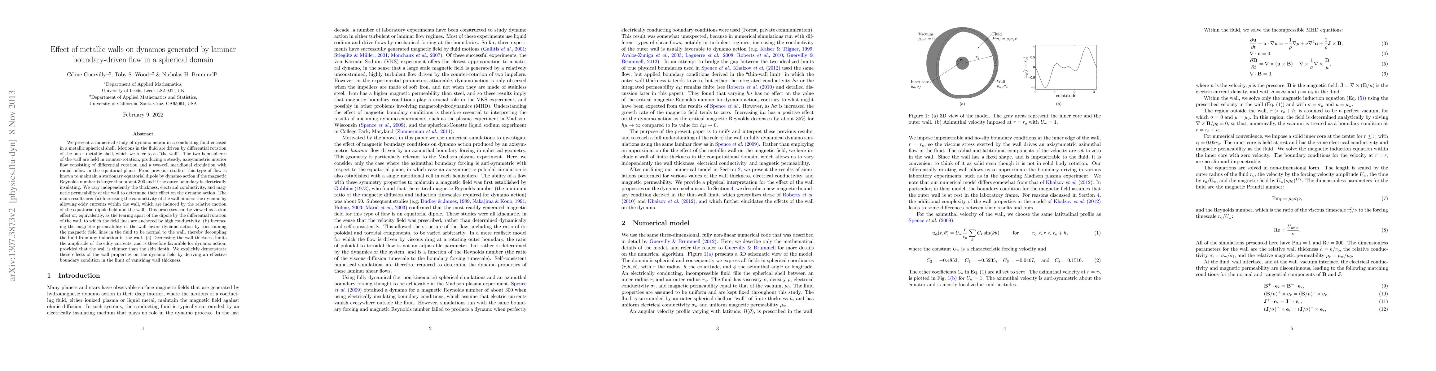 We present a numerical study of dynamo action in a conducting fluid encased in a metallic spherical shell. Motions in the fluid are driven by differential rotation of the outer metallic shell, which we refer to as "the wall". The two hemispheres of the wall are held in counter-rotation, producing a steady, axisymmetric interior flow consisting of differential rotation and a two-cell meridional circulation with radial inflow in the equatorial plane. From previous studies, this type of flow is known to maintain a stationary equatorial dipole by dynamo action if the magnetic Reynolds number is larger than about 300 and if the outer boundary is electrically insulating. We vary independently the thickness, electrical conductivity, and magnetic permeability of the wall to determine their effect on the dynamo action. The main results are: (a) Increasing the conductivity of the wall hinders the dynamo by allowing eddy currents within the wall, which are induced by the relative motion of the equatorial dipole field and the wall. This processes can be viewed as a skin effect or, equivalently, as the tearing apart of the dipole by the differential rotation of the wall, to which the field lines are anchored by high conductivity. (b) Increasing the magnetic permeability of the wall favors dynamo action by constraining the magnetic field lines in the fluid to be normal to the wall, thereby decoupling the fluid from any induction in the wall. (c) Decreasing the wall thickness limits the amplitude of the eddy currents, and is therefore favorable for dynamo action, provided that the wall is thinner than the skin depth. We explicitly demonstrate these effects of the wall properties on the dynamo field by deriving an effective boundary condition in the limit of vanishing wall thickness.