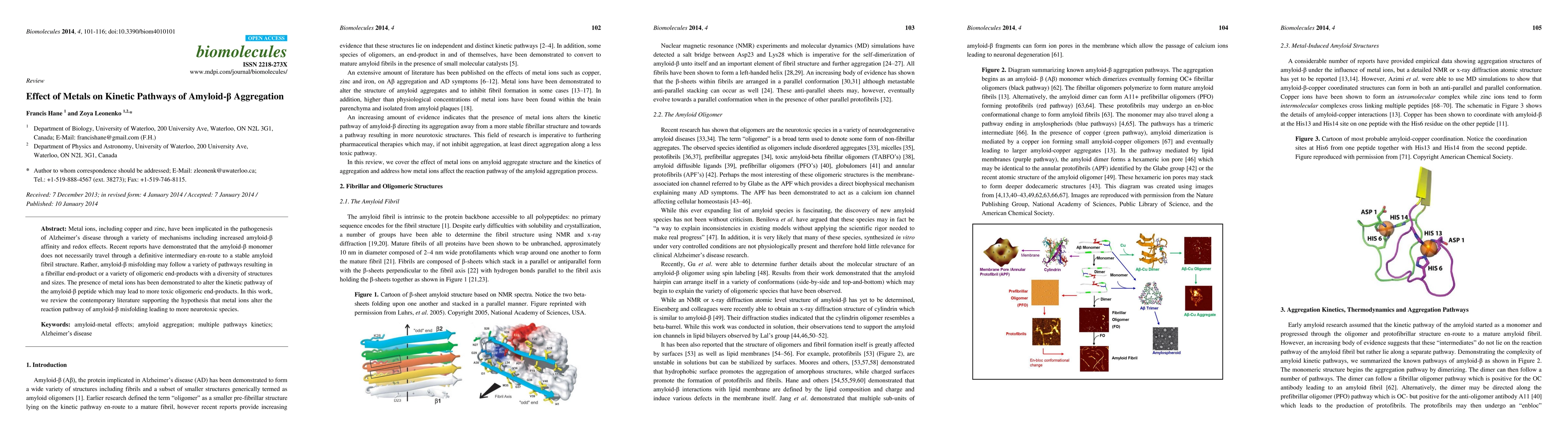 This paper reviews how metal ions like copper and zinc affect the formation of amyloid-beta fibrils, leading to more toxic species in Alzheimer's disease. Metal ions alter the aggregation pathway, resulting in diverse oligomeric end-products with increased neurotoxicity.