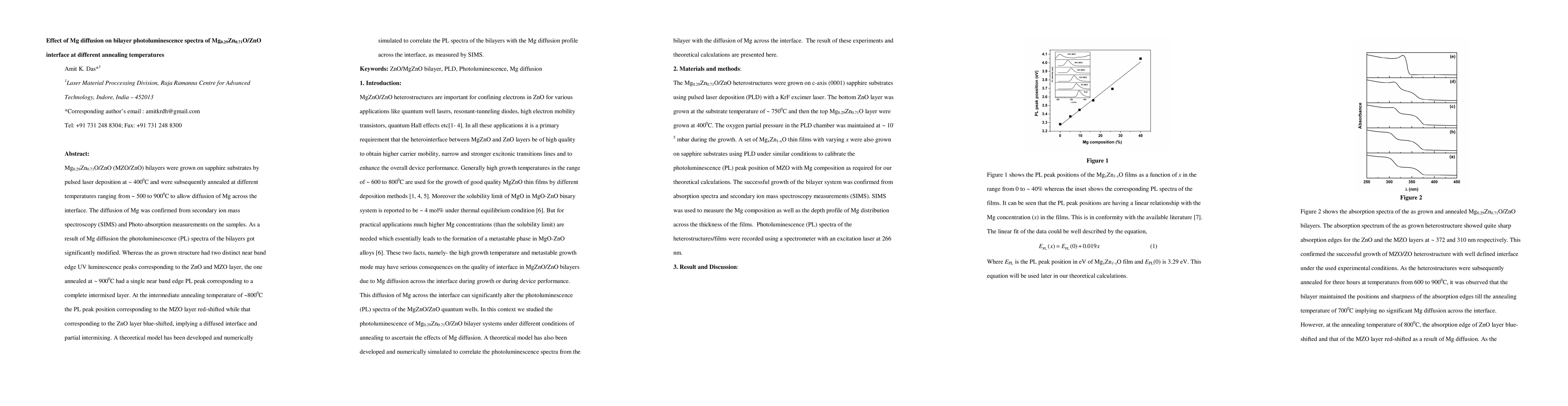 Mg0.29Zn0.71O/ZnO (MZO/ZnO) bilayers were grown on sapphire substrates by pulsed laser deposition at ~ 400 C and were subsequently annealed at different temperatures ranging from ~ 500 to 900 C to allow diffusion of Mg across the interface. The diffusion of Mg was confirmed from secondary ion mass spectroscopy (SIMS) and Photo-absorption measurements on the samples. As a result of Mg diffusion the photoluminescence (PL) spectra of the bilayers got significantly modified. Whereas the as grown structure had two distinct near band edge UV luminescence peaks corresponding to the ZnO and MZO layer, the one annealed at ~ 900 C had a single near band edge PL peak corresponding to a complete intermixed layer. At the intermediate annealing temperature of ~800 C the PL peak position corresponding to the MZO layer red-shifted while that corresponding to the ZnO layer blue-shifted, implying a diffused interface and partial intermixing. A theoretical model has been developed and numerically simulated to correlate the PL spectra of the bilayers with the Mg diffusion profile across the interface, as measured by SIMS.