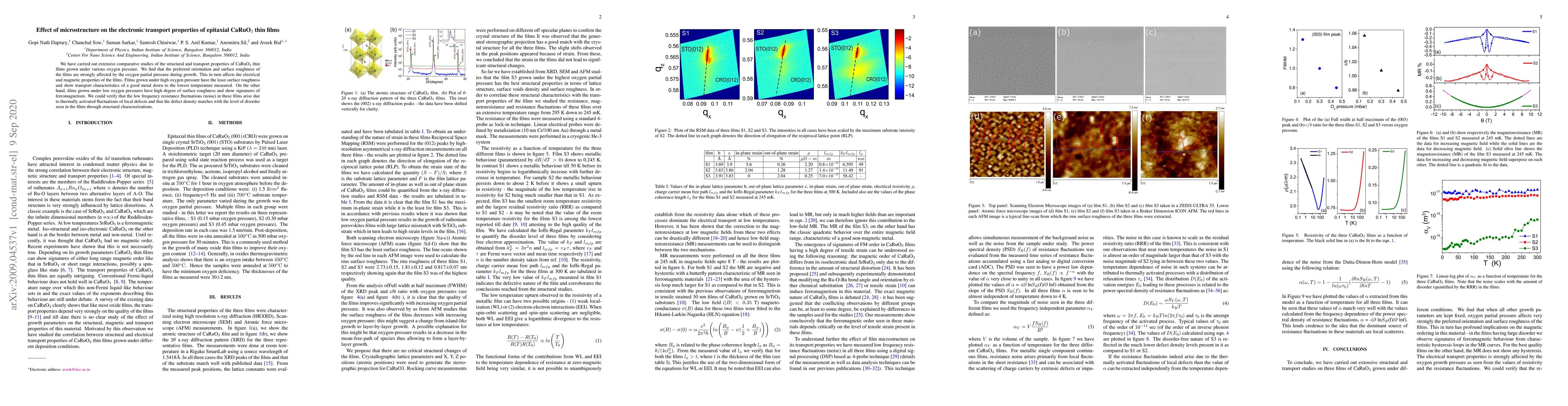 We have carried out extensive comparative studies of the structural and transport properties of CaRuO$_3$ thin films grown under various oxygen pressure. We find that the preferred orientation and surface roughness of the films are strongly affected by the oxygen partial pressure during growth. This in turn affects the electrical and magnetic properties of the films. Films grown under high oxygen pressure have the least surface roughness and show transport characteristics of a good metal down to the lowest temperature measured. On the other hand, films grown under low oxygen pressures have high degree of surface roughness and show signatures of ferromagnetism. We could verify that the low frequency resistance fluctuations (noise) in these films arise due to thermally activated fluctuations of local defects and that the defect density matches with the level of disorder seen in the films through structural characterizations.