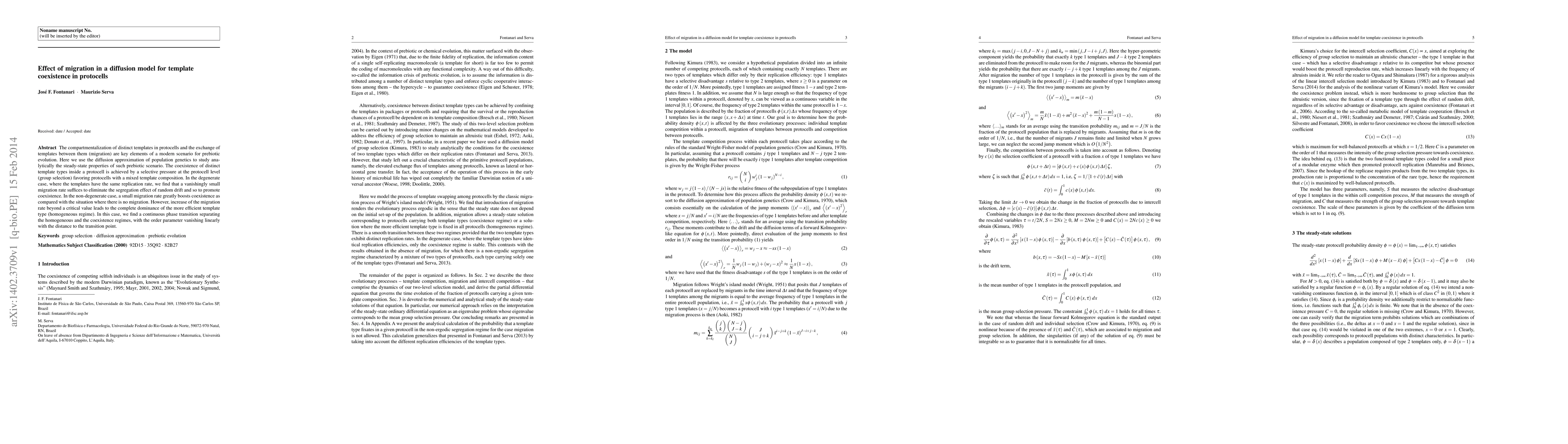 The compartmentalization of distinct templates in protocells and the exchange of templates between them (migration) are key elements of a modern scenario for prebiotic evolution. Here we use the diffusion approximation of population genetics to study analytically the steady-state properties of such prebiotic scenario. The coexistence of distinct template types inside a protocell is achieved by a selective pressure at the protocell level (group selection) favoring protocells with a mixed template composition. In the degenerate case, where the templates have the same replication rate, we find that a vanishingly small migration rate suffices to eliminate the segregation effect of random drift and so to promote coexistence. In the non-degenerate case, a small migration rate greatly boosts coexistence as compared with the situation where there is no migration. However, increase of the migration rate beyond a critical value leads to the complete dominance of the more efficient template type (homogeneous regime). In this case, we find a continuous phase transition separating the homogeneous and the coexistence regimes, with the order parameter vanishing linearly with the distance to the transition point.