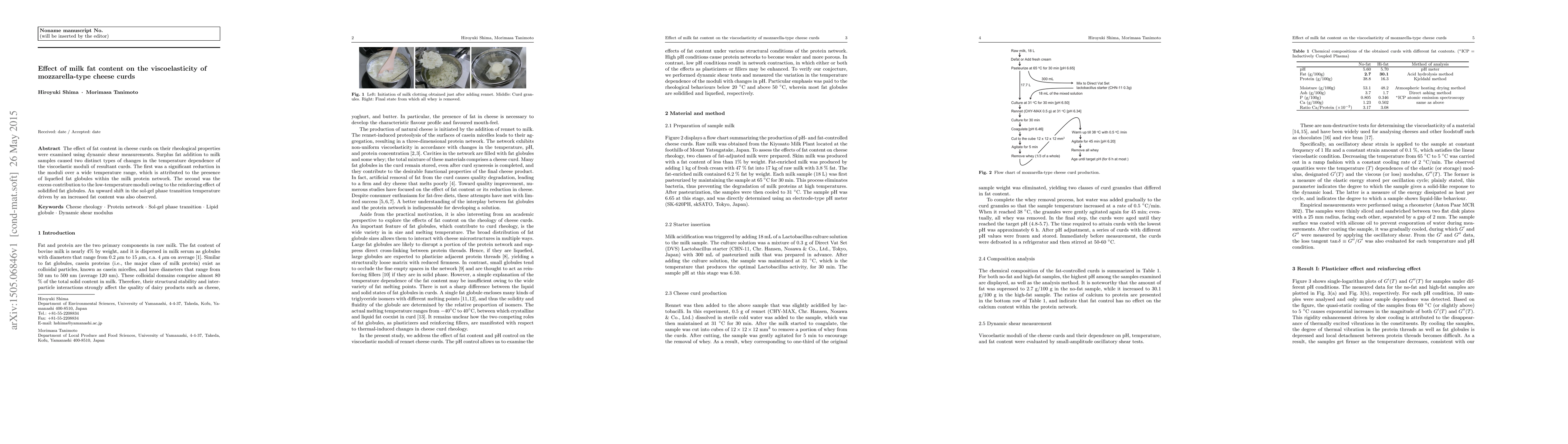 The effect of fat content in cheese curds on their rheological properties was examined using dynamic shear measurements. Surplus fat addition to milk samples caused two distinct types of changes in the temperature dependence of the viscoelastic moduli of resultant curds. The first was a significant reduction in the moduli over a wide temperature range, which is attributed to the presence of liquefied fat globules within the milk protein network. The second was the excess contribution to the low-temperature moduli owing to the reinforcing effect of solidified fat globules. An upward shift in the sol-gel phase transition temperature driven by an increased fat content was also observed.