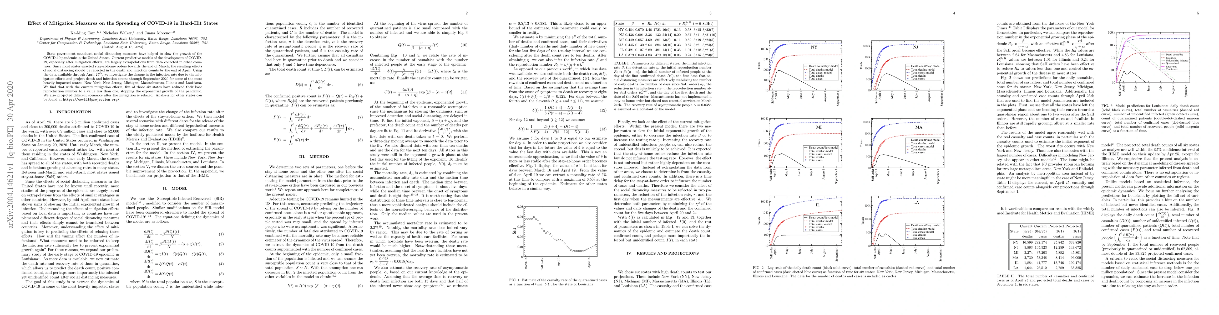 State government-mandated social distancing measures have helped to slow down the growth of the COVID-19 pandemic in the United States. Current predictive models of the development of COVID-19, especially after mitigation efforts, are largely based on extrapolating the data from other countries. Since most states enforced stay-at-home orders towards the end of March, their effect should be reflected in the death and infection counts at the end of April. Using the data available until April 25th, we investigate the change in the infection rate due to the mitigation efforts, and project death and infection counts until September, 2020, for some of the most heavily impacted states: New York, New Jersey, Michigan, Massachusetts, Illinois and Louisiana. We find that with the current mitigation efforts five of those six states reduce their reproduction number to a value less than one, stopping the exponential growth of the pandemic. We also projected different scenarios after the mitigation is relaxed. Analysis for other states can be found at https://covid19projection.org/.