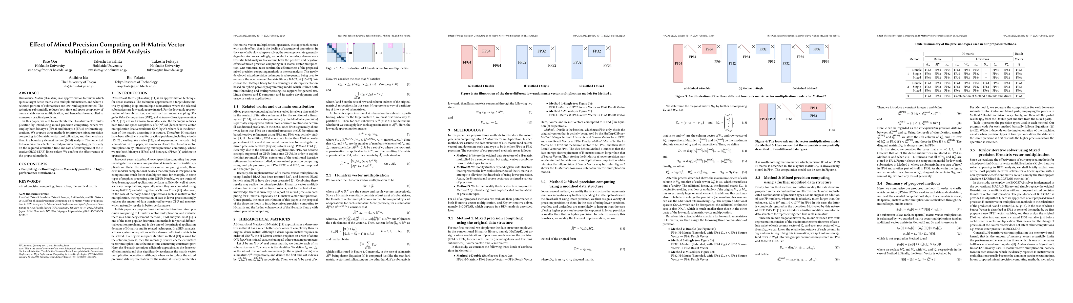 This paper investigates the use of mixed precision computing to accelerate H-matrix vector multiplication in boundary element method (BEM) analysis. Three methods employing both FP64 and FP32 arithmetic are proposed and evaluated, showing reduced simulation time and improved convergence rates for the BiCG-STAB linear solver.