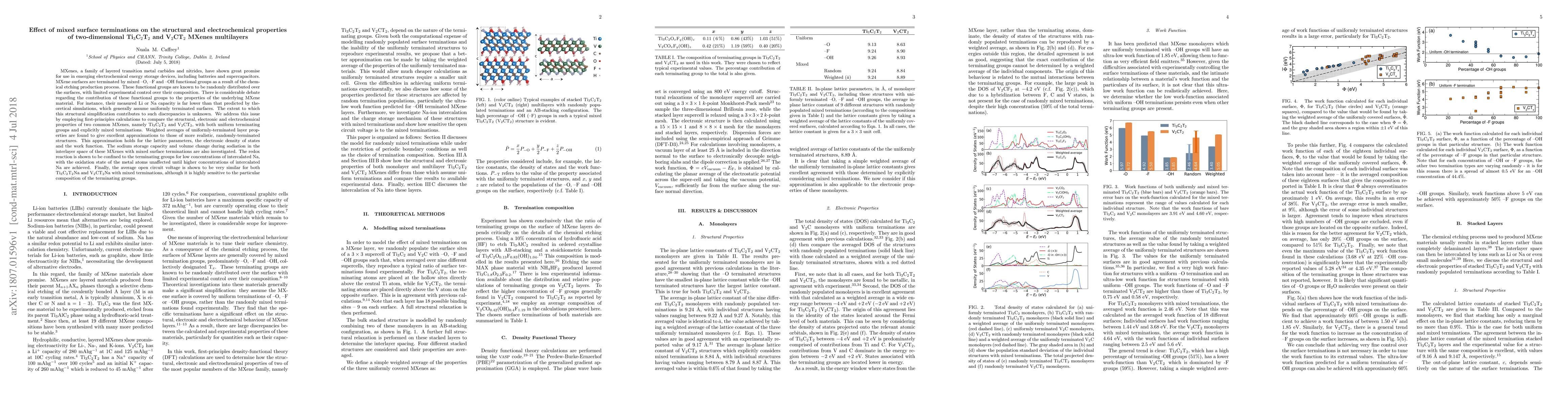 The paper presents a detailed computational study on the effect of mixed surface terminations on the structural and electrochemical properties of Ti3C2T2 and V2CT2 MXenes, providing a method to approximate realistic, randomly-terminated structures using weighted averages of uniform terminations.